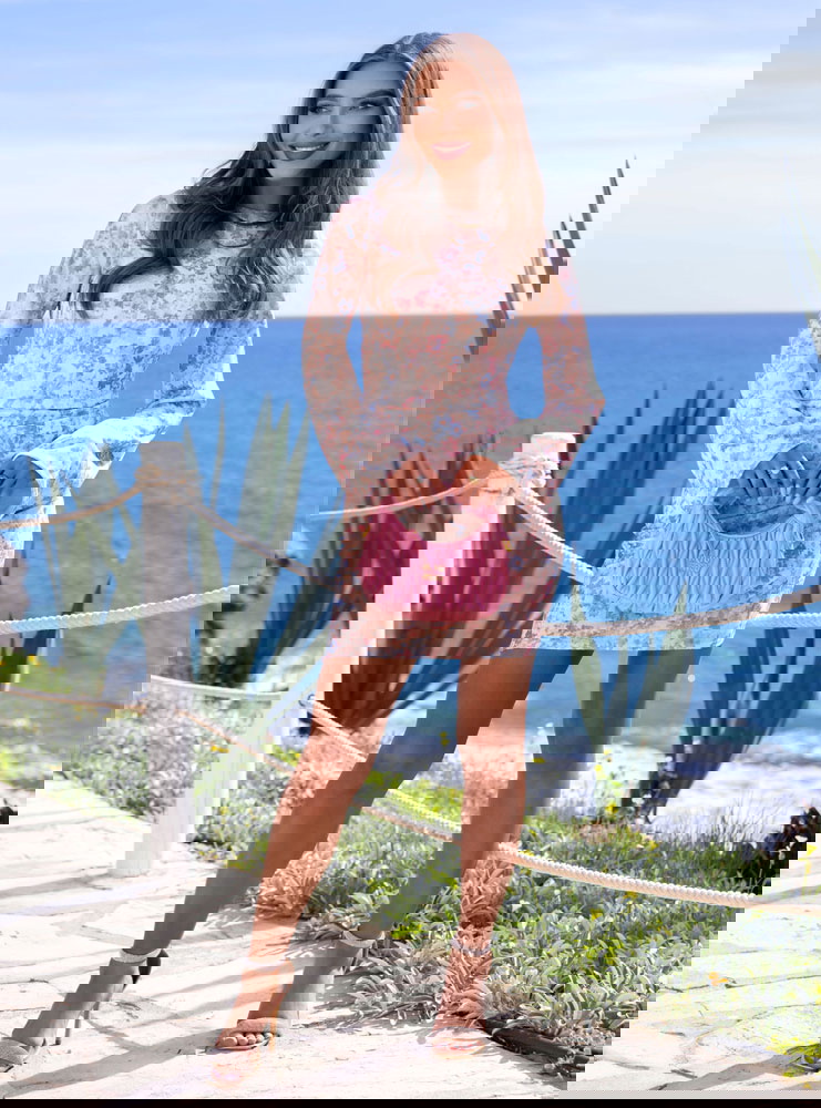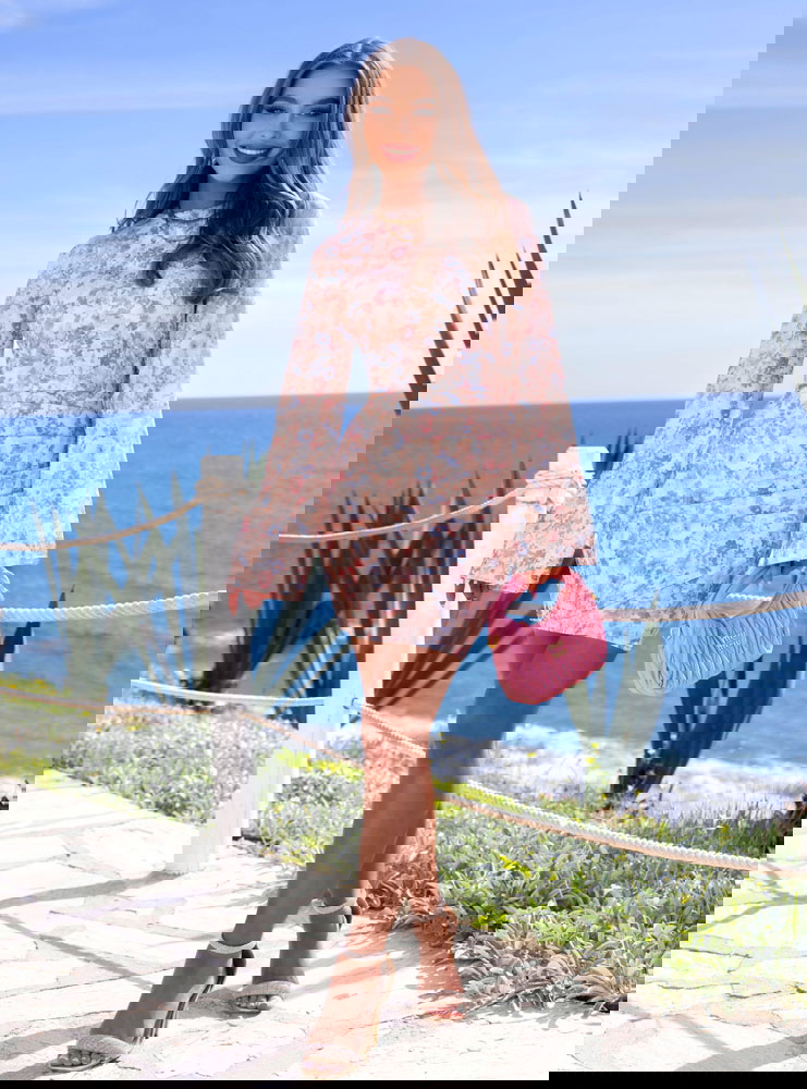 Kwiatowy wzór dodaje stylizacji świeżości, a marszczenia podkreślają sylwetkę i nadają jej kobiecego charakteru.