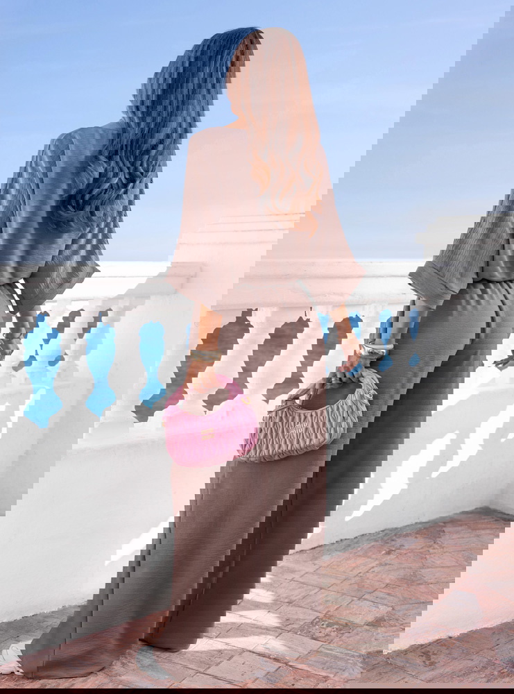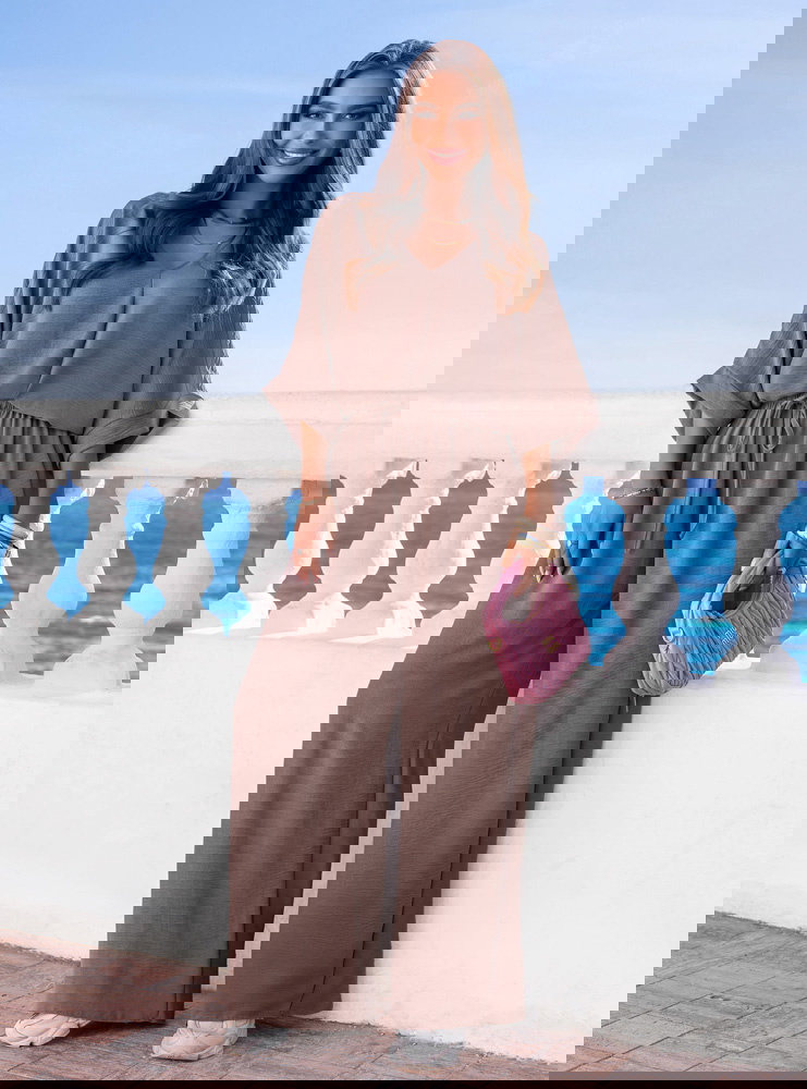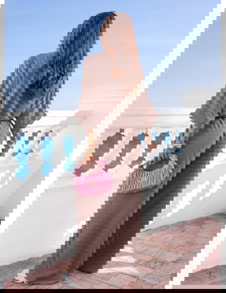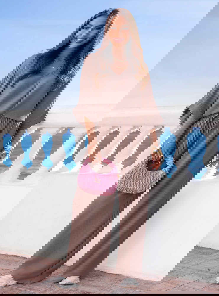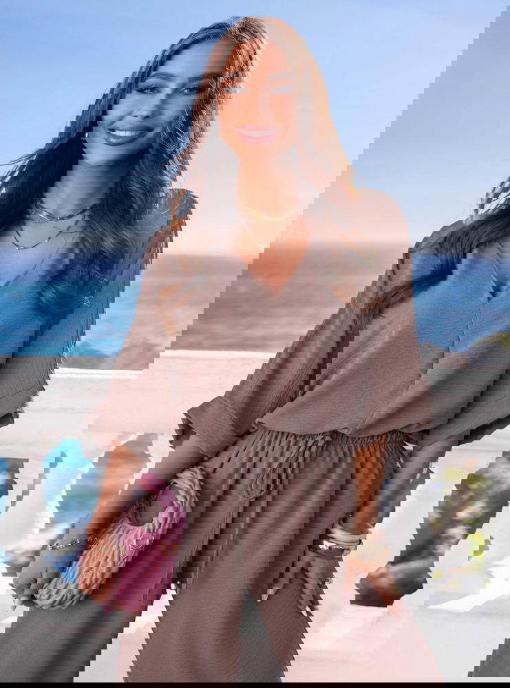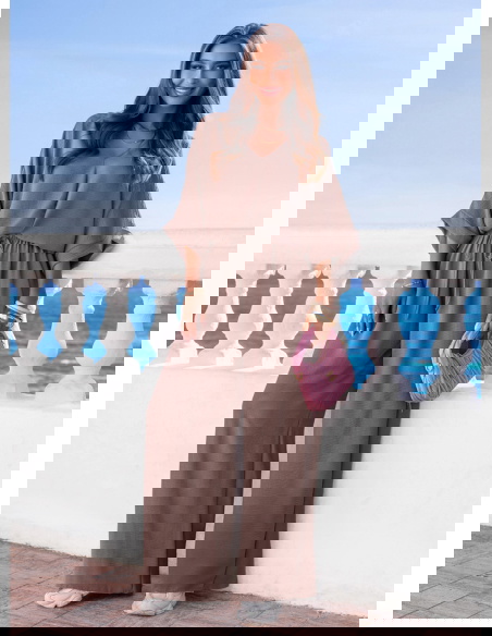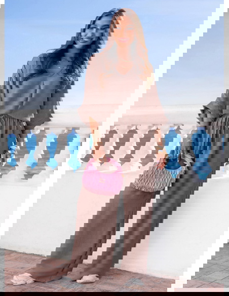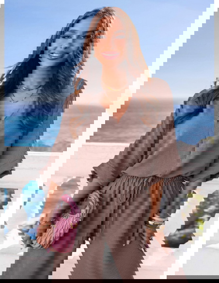 Komplet bluzka z dekoltem w serek i spodnie Gaylenee - mocha mousse