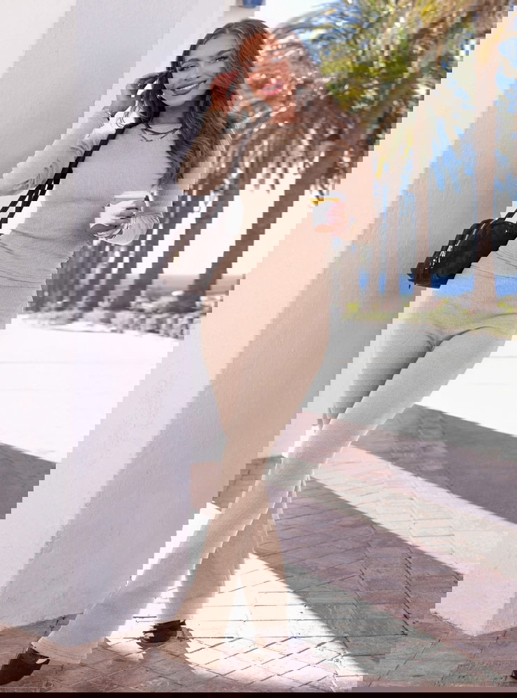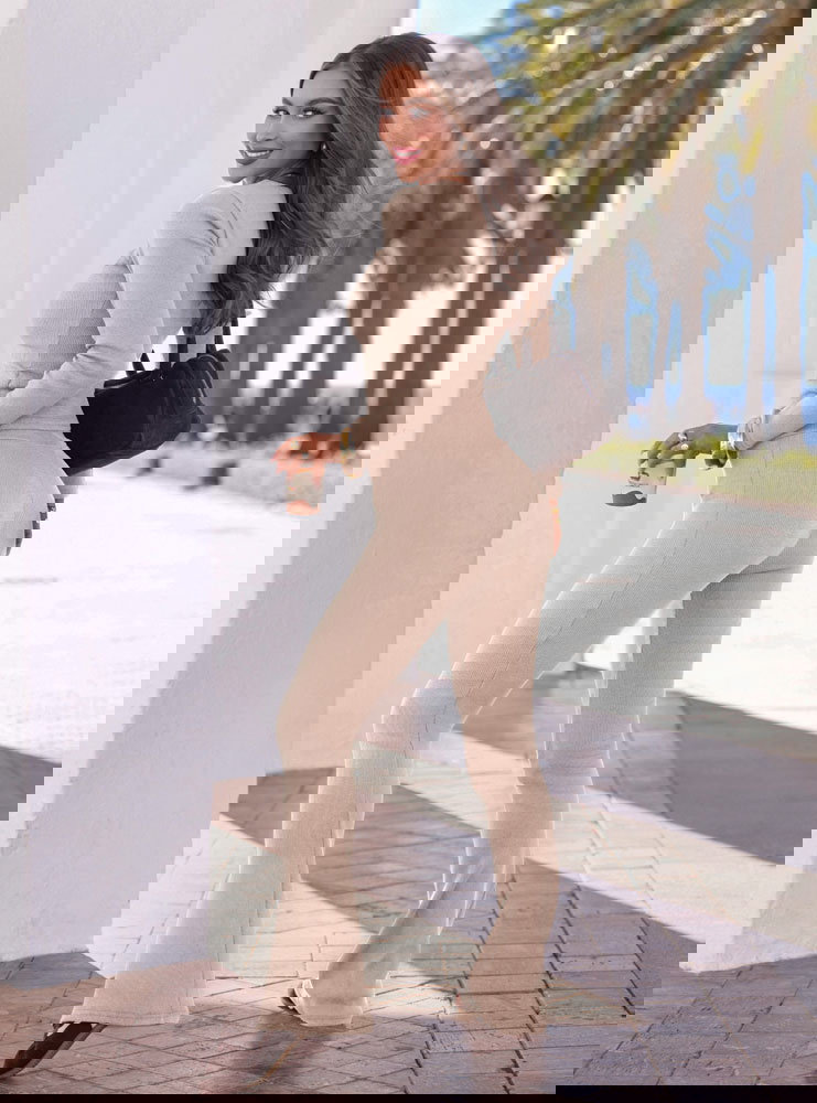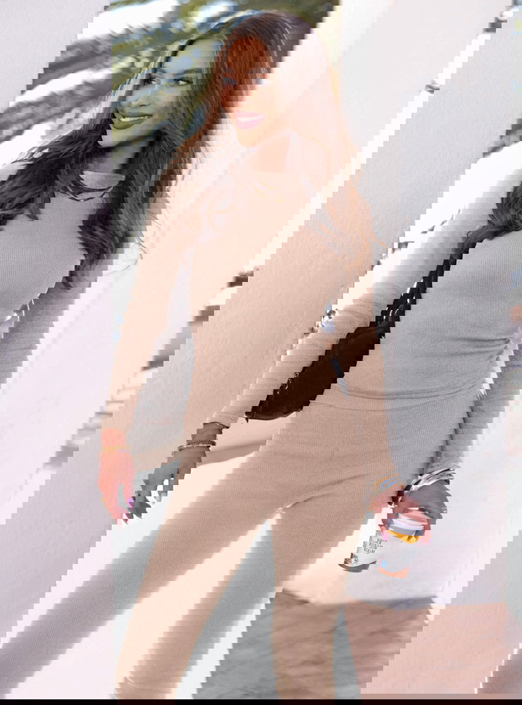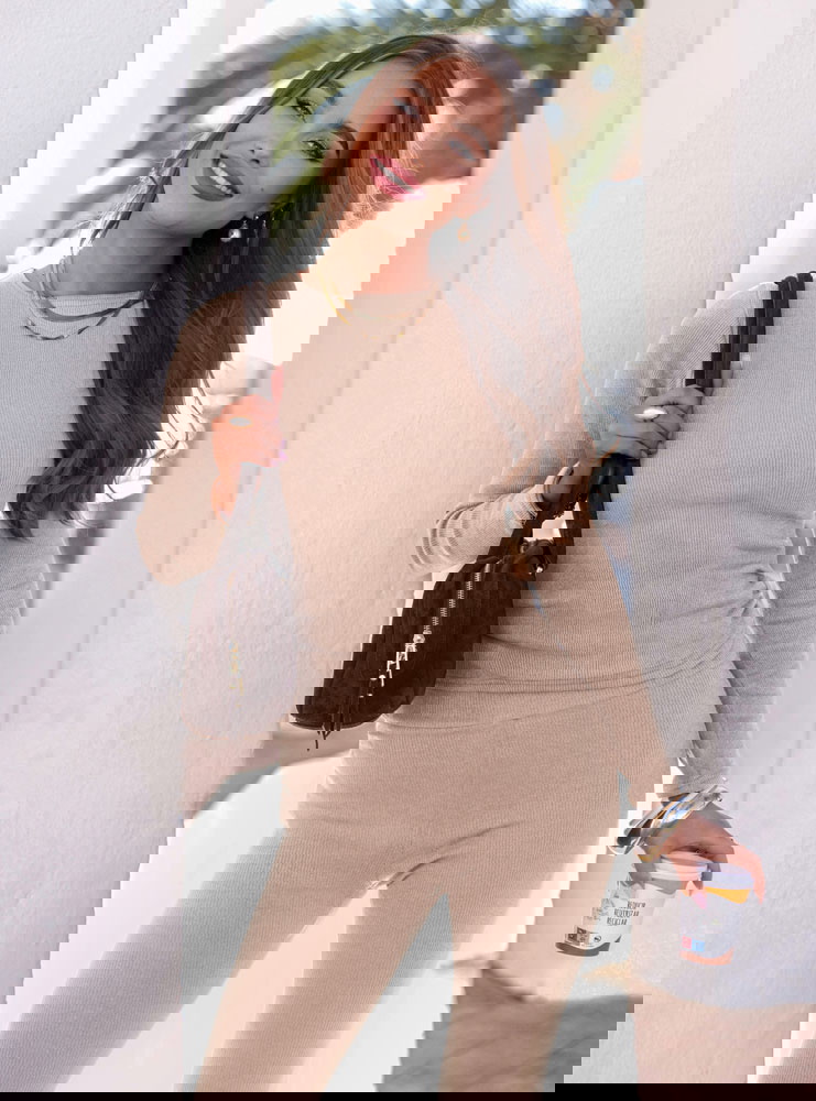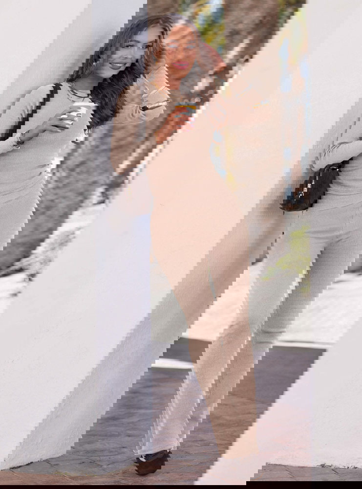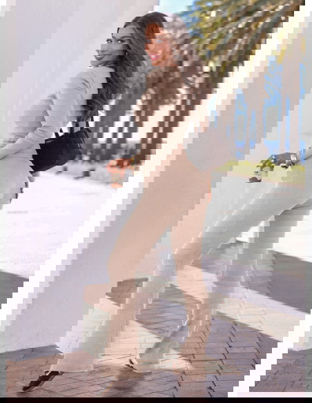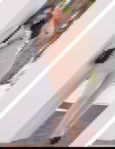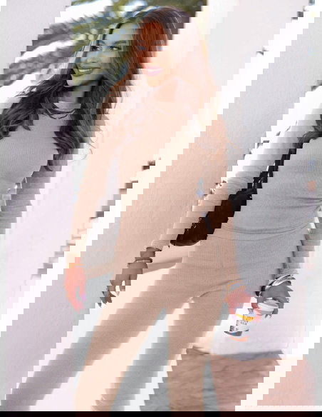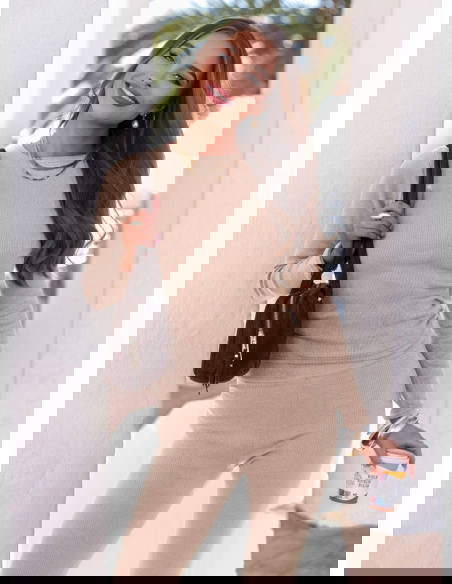 Beżowy prążkowany komplet dopasowana bluzka i spodnie Navienne