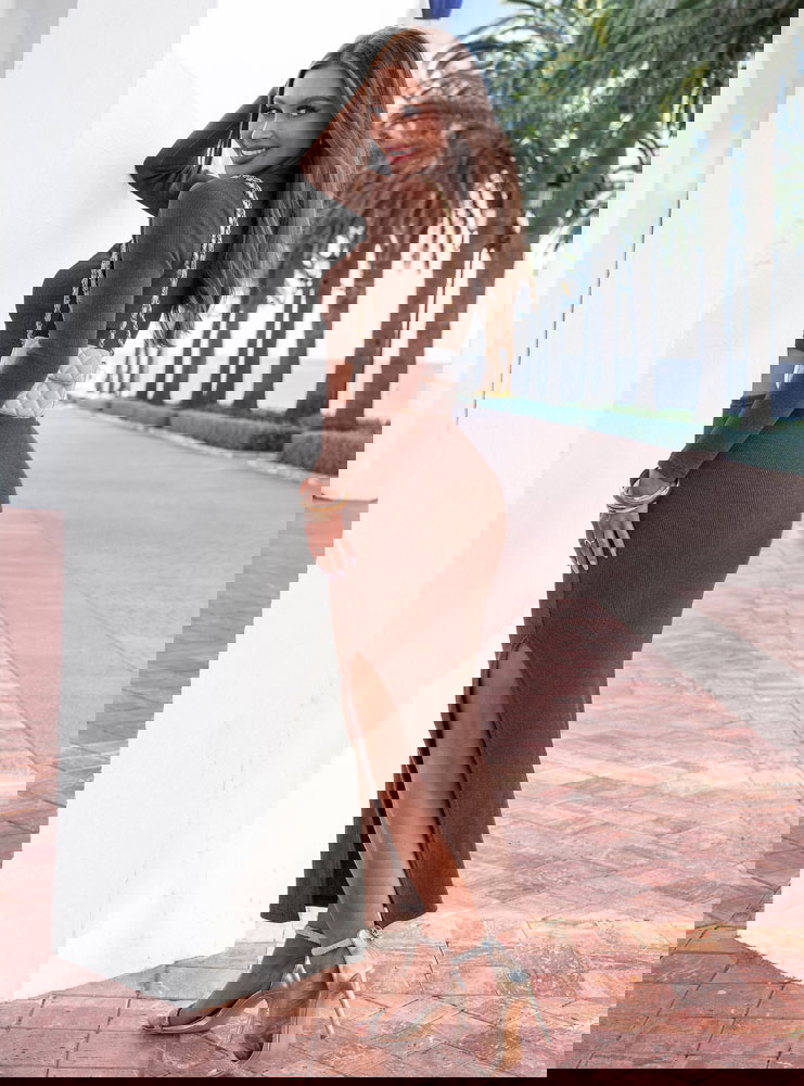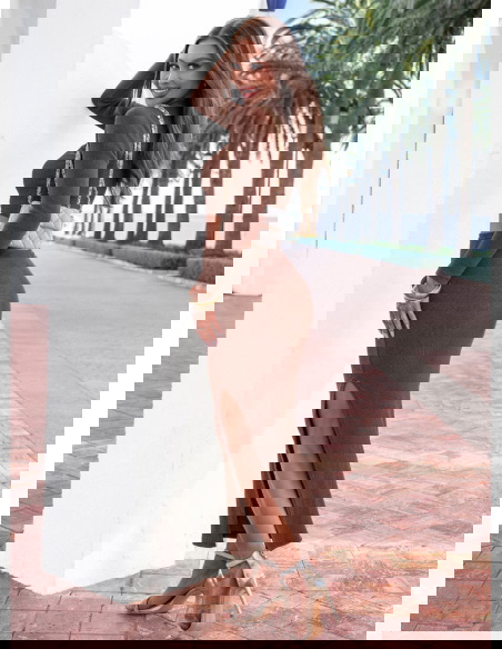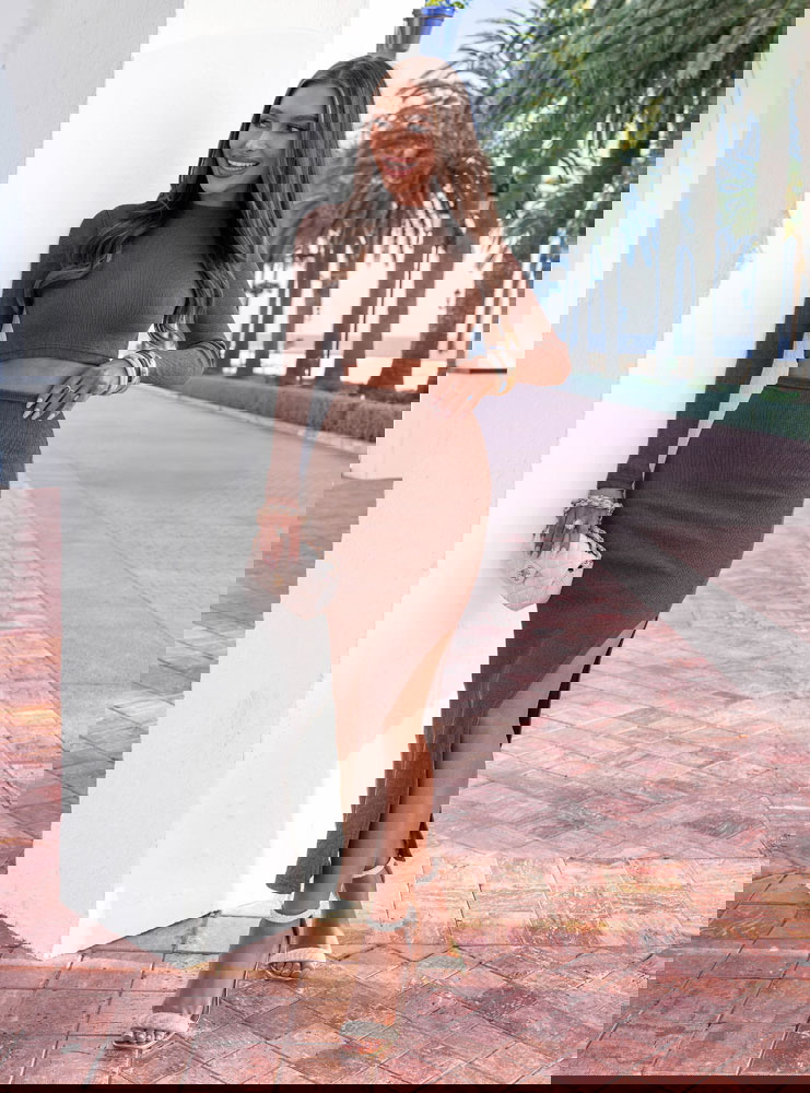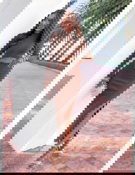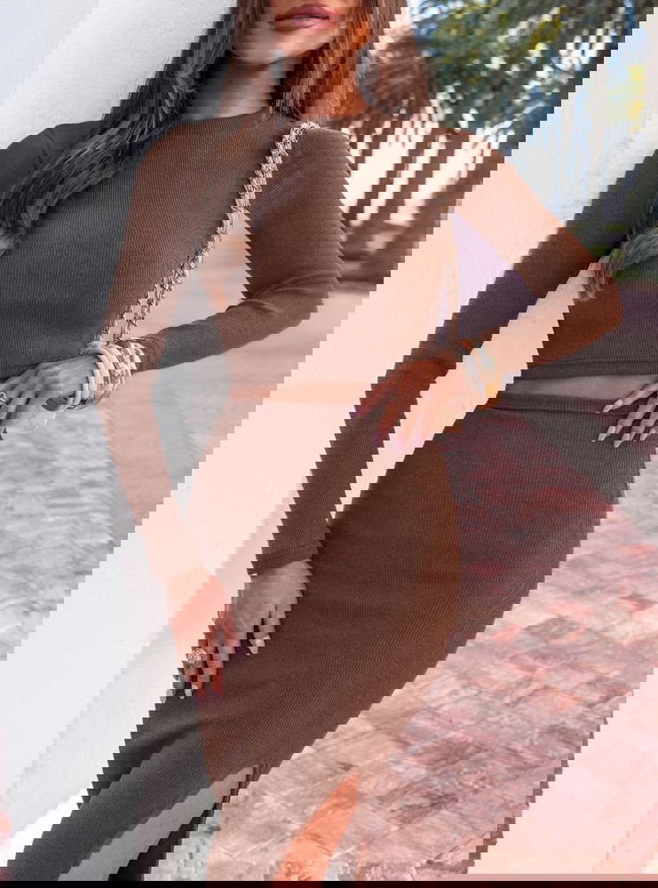Prążkowany komplet top+spódnica z rozcięciem Kasyleen - mocha mousse