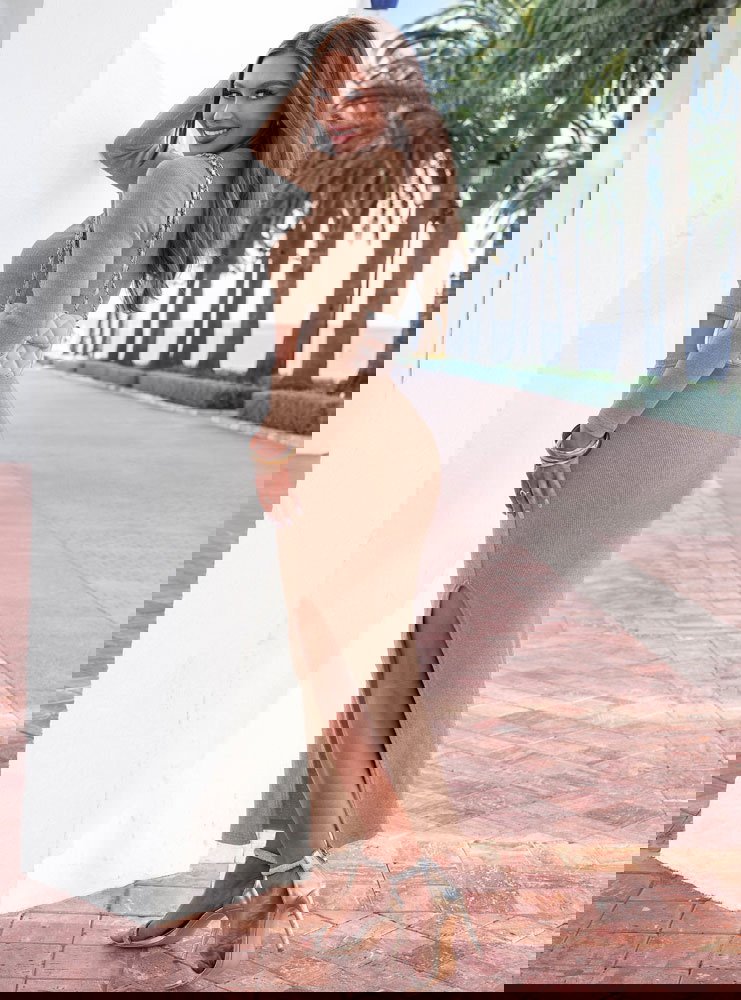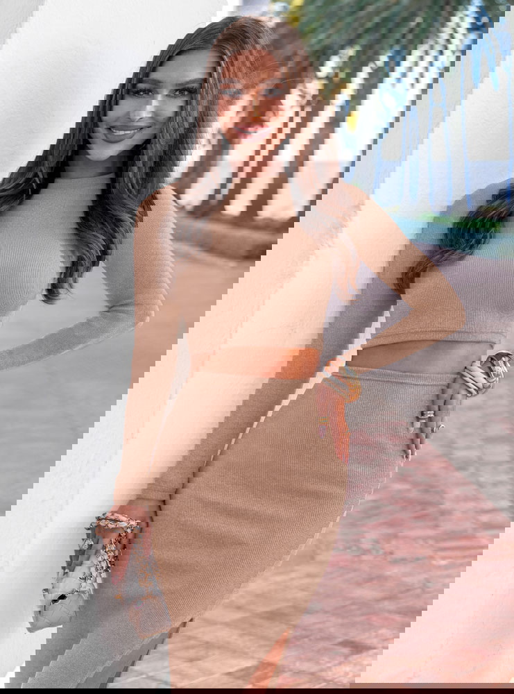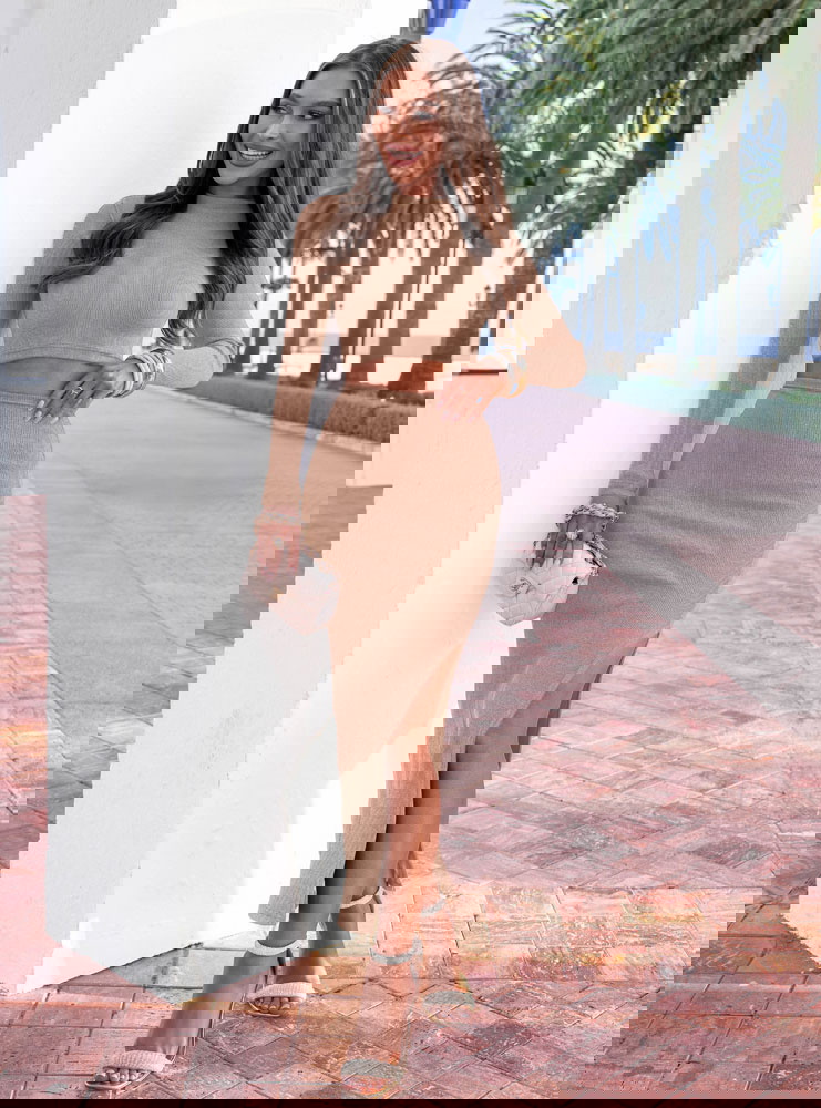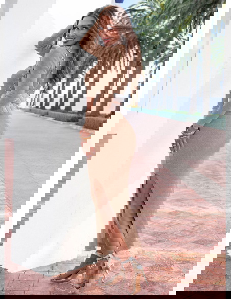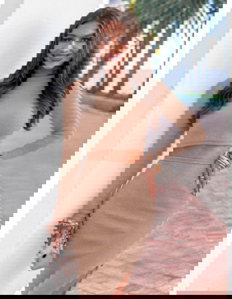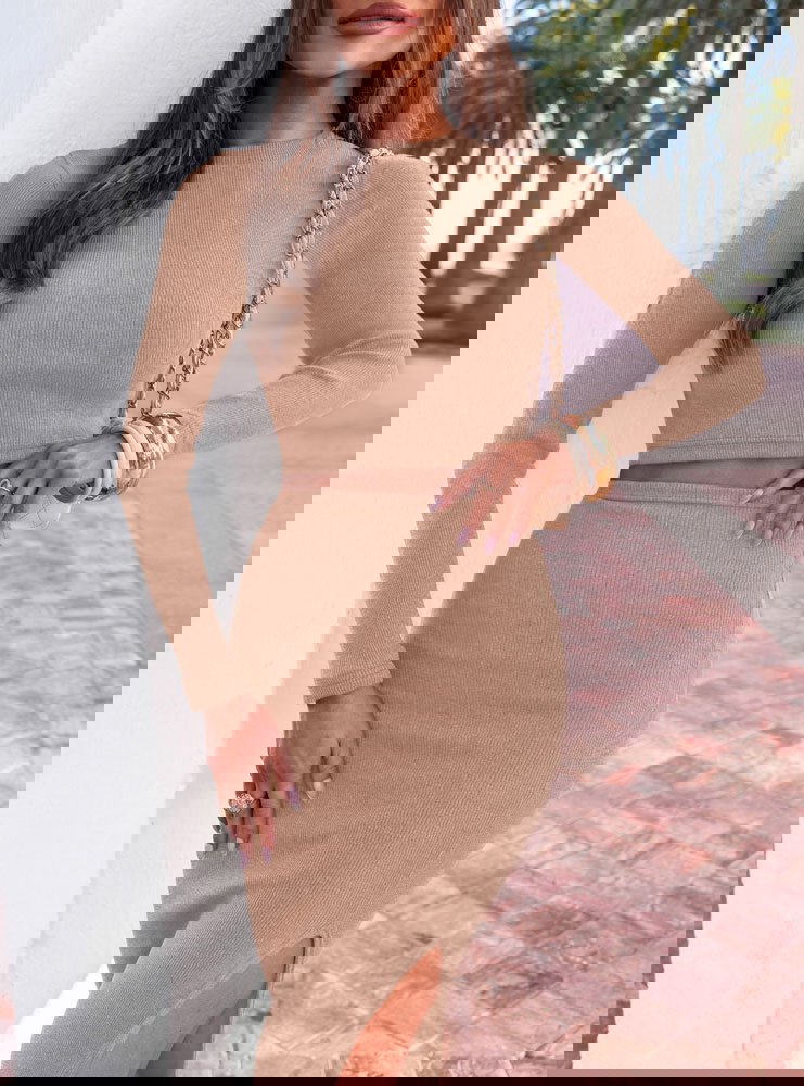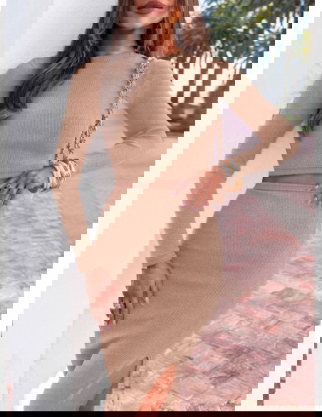 Beżowy prążkowany komplet top+spódnica z rozcięciem Kasyleen