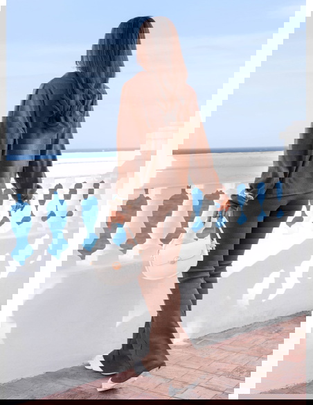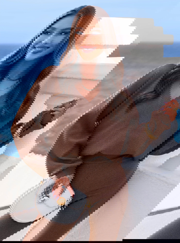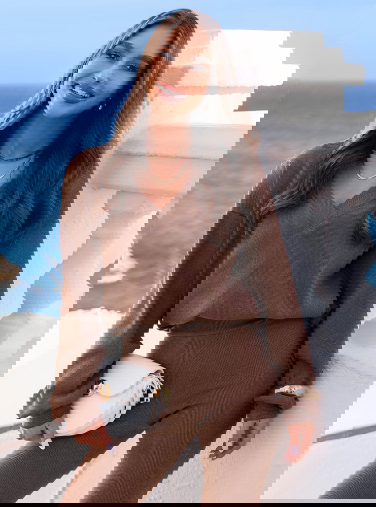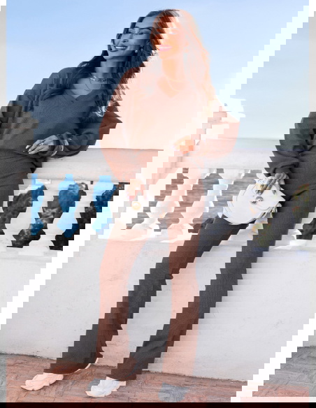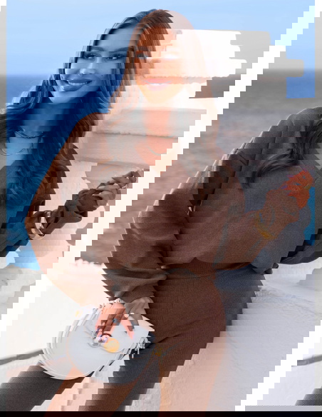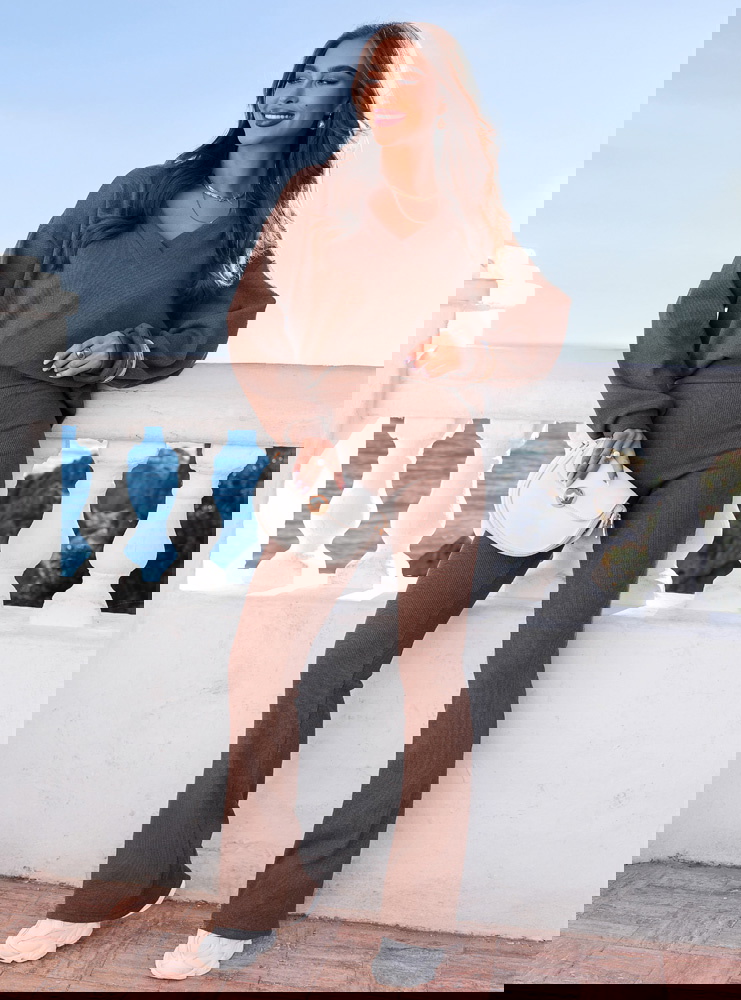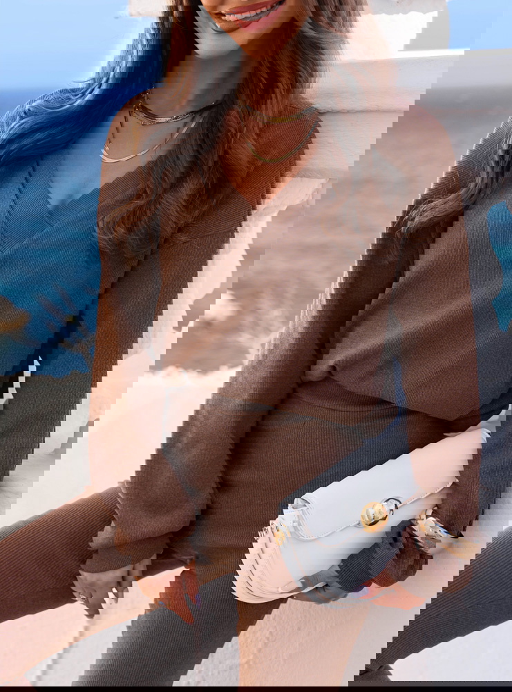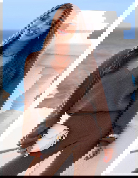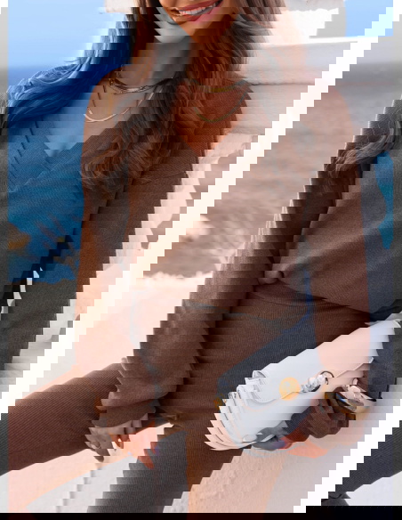 Prążkowany komplet bluzka z dekoltem w serek i spodnie Nellwyn - mocha mousse