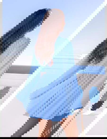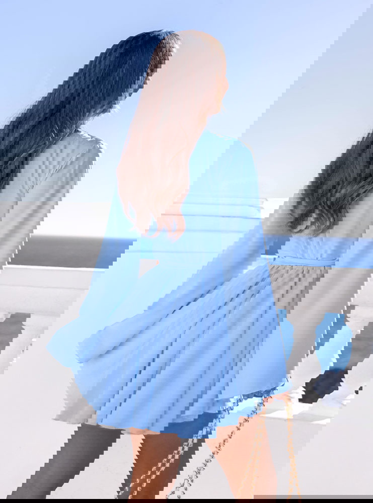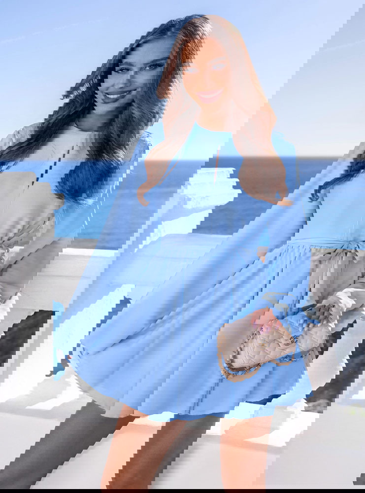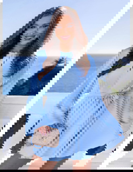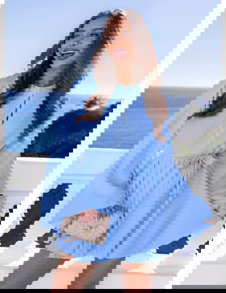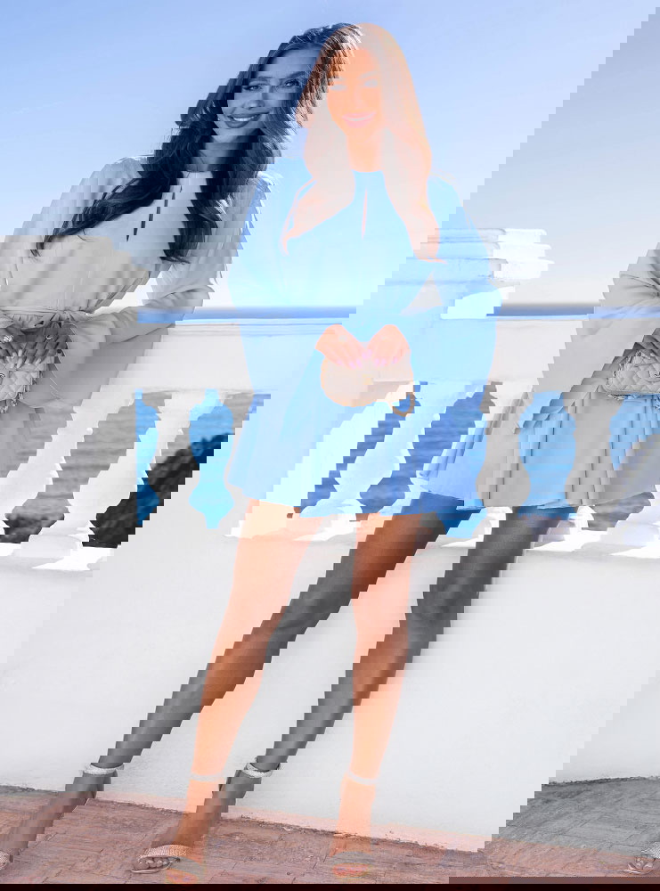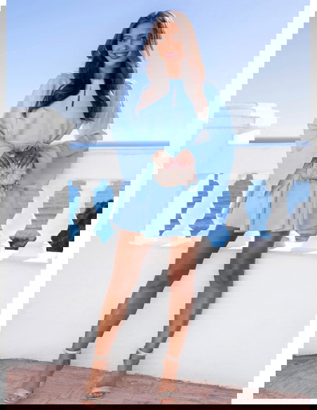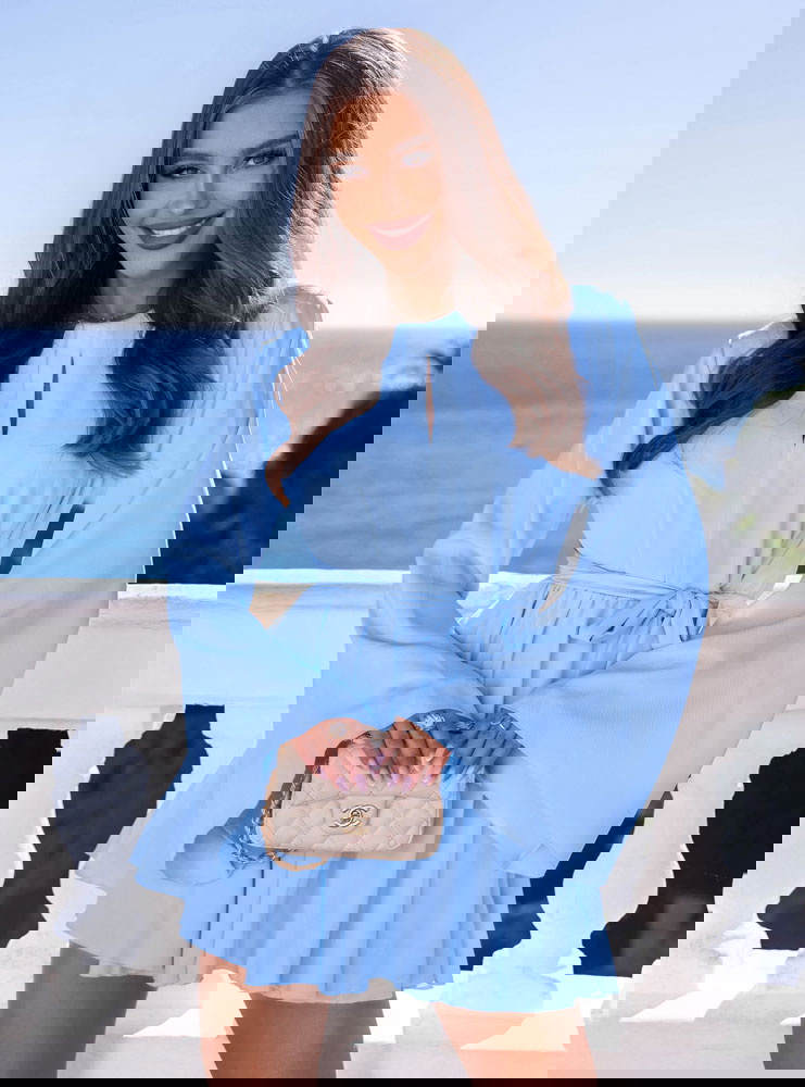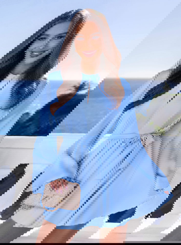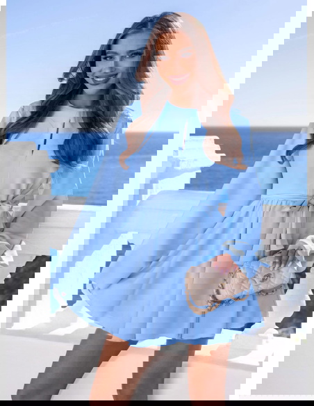 Błękitny kombinezon jak sukienka wiązany w talii Kolleea to lekka, świeża propozycja w pastelowym wydaniu. Jasny błękit przyciąga wzrok i pięknie podkreśla letnią opaleniznę. Prosta góra z subtelnym wycięciem przy dekolcie dodaje delikatności i optycznie wysmukla górną część sylwetki. Długie, zwiewne rękawy nadają całości miękkości i sprawiają, że model wygląda bardzo lekko w ruchu. Talia podkreślona paskiem pozwala regulować dopasowanie i wyraźnie zaznaczyć proporcje. Dół układa się jak rozkloszowana mini, dzięki czemu kombinezon daje efekt sukienki, zachowując wygodę noszenia. To idealny wybór na wiosenne i letnie okazje.