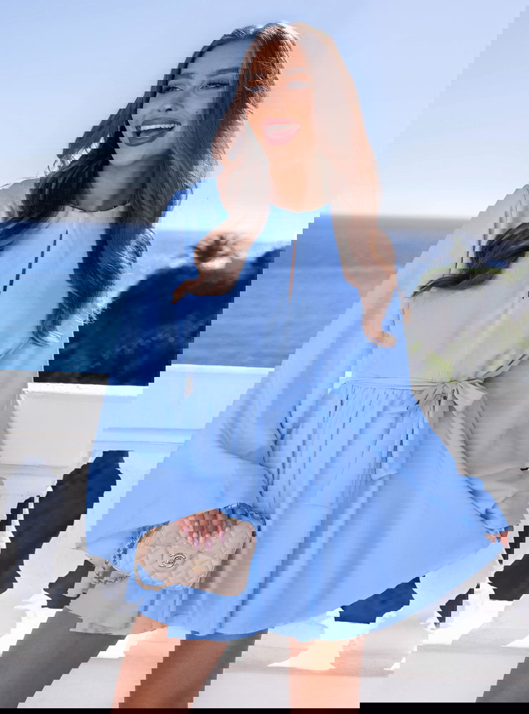 Błękitny kombinezon jak sukienka wiązany w talii Kolleea
