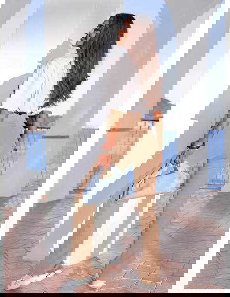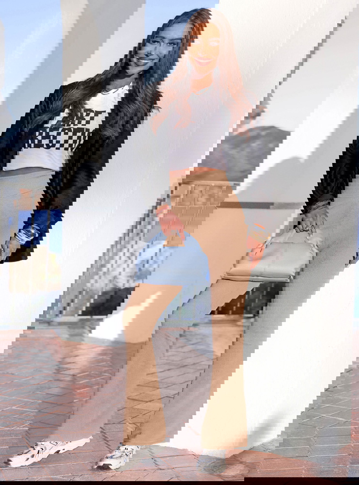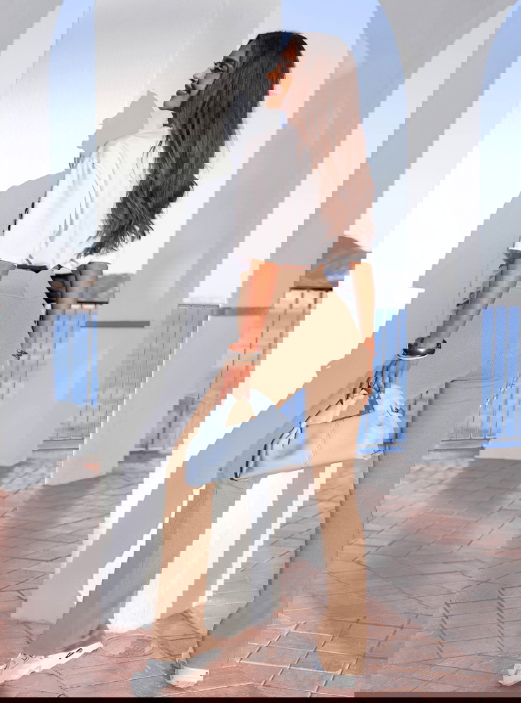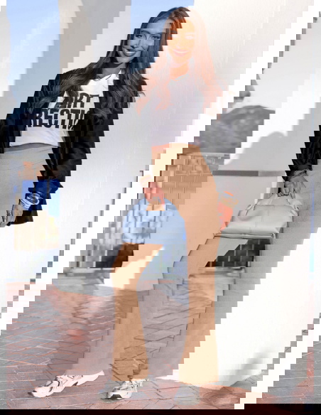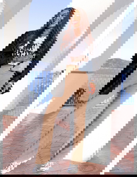 Ciepły beż i rozszerzana nogawka tworzą model, który wysmukla sylwetkę i nadaje jej lekkości.