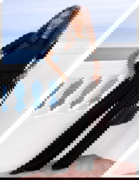 Szerokie nogawki i klasyczna czerń tworzą wygodny, kobiecy zestaw na wiele okazji.