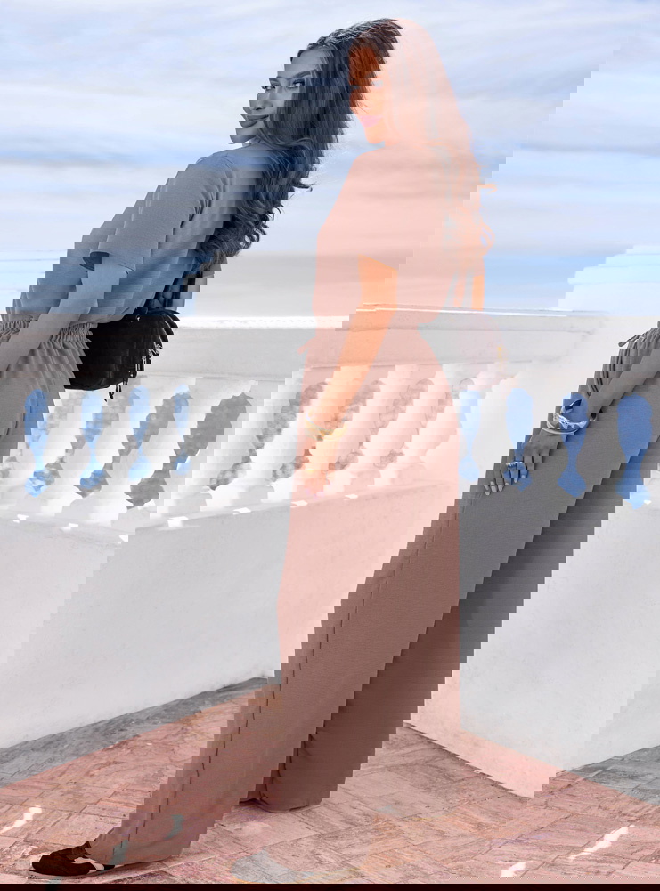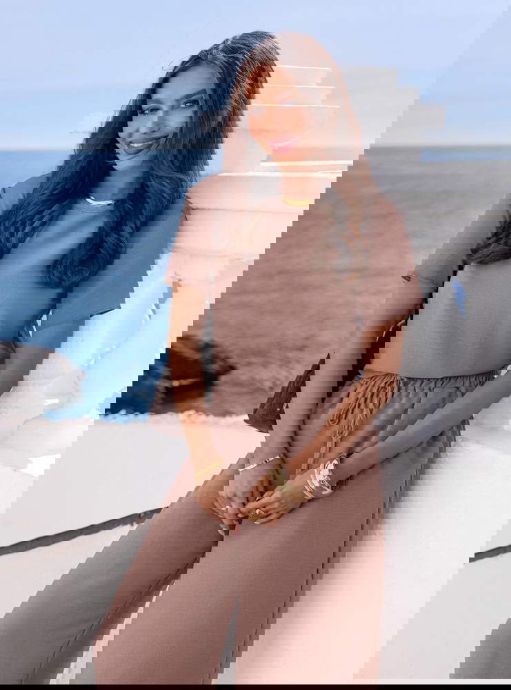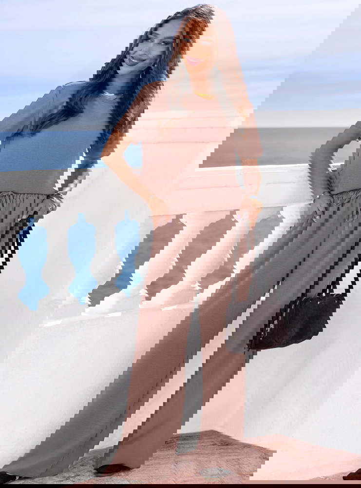Szerokie nogawki i ciepły odcień mocha mousse tworzą wygodny, kobiecy zestaw na wiele okazji.