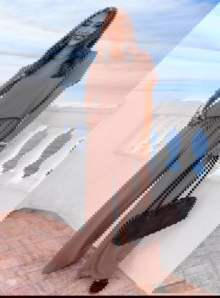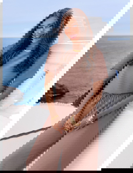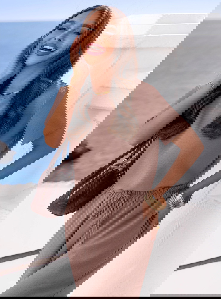 Komplet bluzka z krótkim rękawem i szerokie spodnie Chardanae - mocha mousse to lekka, swobodna stylizacja w ciepłym odcieniu brązu. Kolor mocha mousse wygląda miękko i elegancko, dlatego sprawdzi się zarówno na co dzień, jak i w bardziej dopracowanych zestawach. Bluzka ma prosty, luźny fason i klasyczny krótki rękaw, co daje komfort noszenia przez cały dzień. Szerokie spodnie pięknie układają się w ruchu i optycznie wydłużają sylwetkę. Elastyczna talia z wiązaniem pozwala dopasować je do figury i delikatnie podkreślić talię. Materiał jest przyjemny dla skóry i zapewnia swobodę, nawet w cieplejsze dni. To gotowy komplet, który wygląda spójnie i nowocześnie.