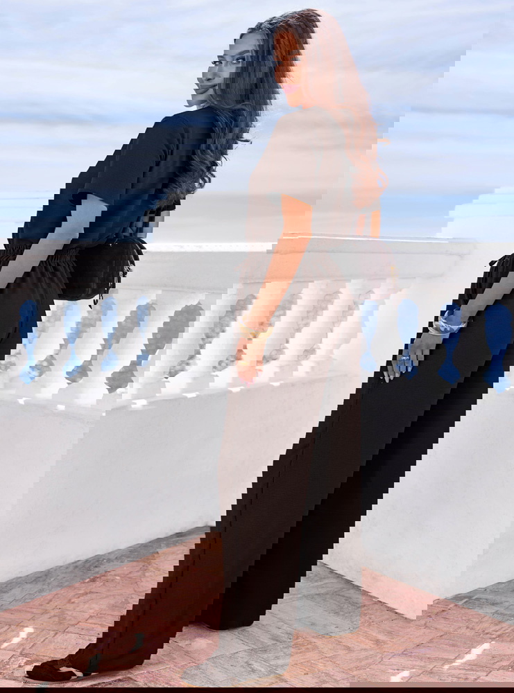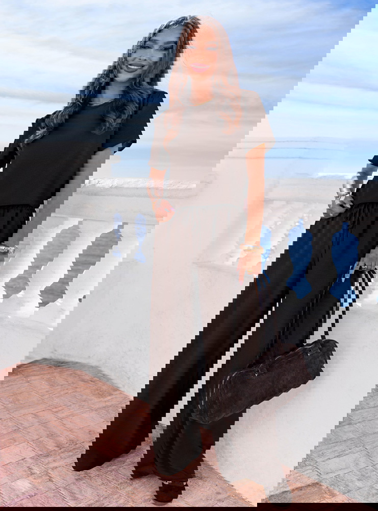 Szerokie nogawki i głęboki czekoladowy odcień tworzą wygodny, kobiecy zestaw na wiele okazji.