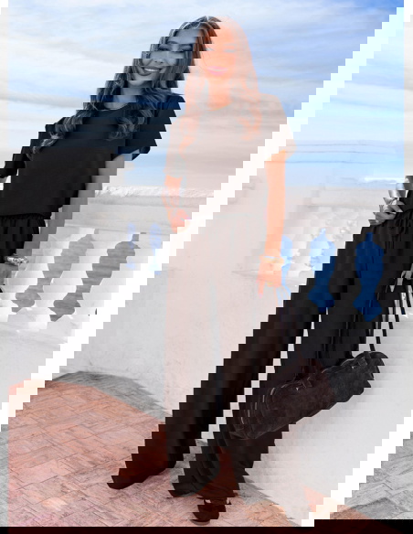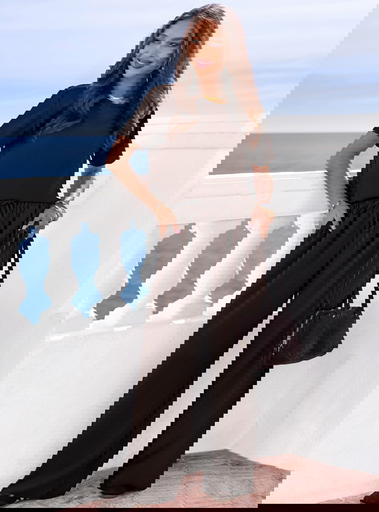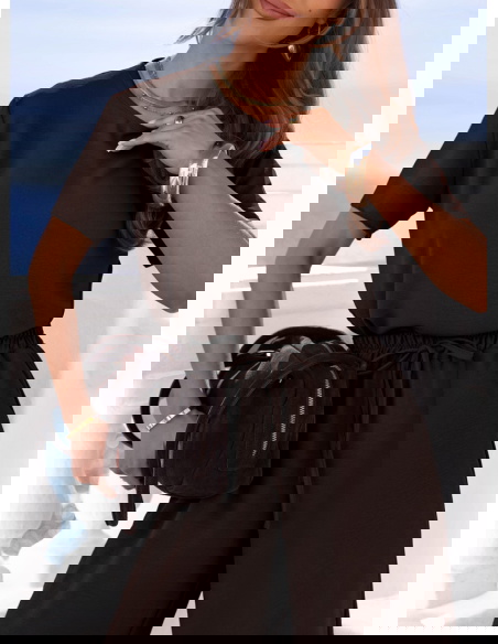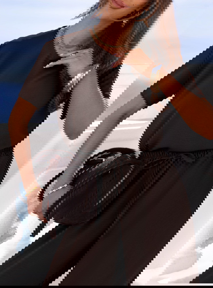 Czekoladowy komplet bluzka z krótkim rękawem i szerokie spodnie Chardanae to swobodna, a jednocześnie elegancka propozycja w głębokim odcieniu brązu. Czekoladowy kolor dodaje stylizacji charakteru i sprawia, że całość wygląda spójnie oraz kobieco. Bluzka ma prosty, luźny krój i klasyczny krótki rękaw, dzięki czemu dobrze układa się na sylwetce. Szerokie spodnie pięknie płyną w ruchu i optycznie wydłużają nogi. Elastyczna talia z wiązaniem pozwala dopasować fason do figury i podkreślić talię. Materiał jest lekki i przyjemny w noszeniu, dlatego komplet sprawdzi się w cieplejsze dni. To gotowy zestaw, który wygląda stylowo bez nadmiaru dodatków.