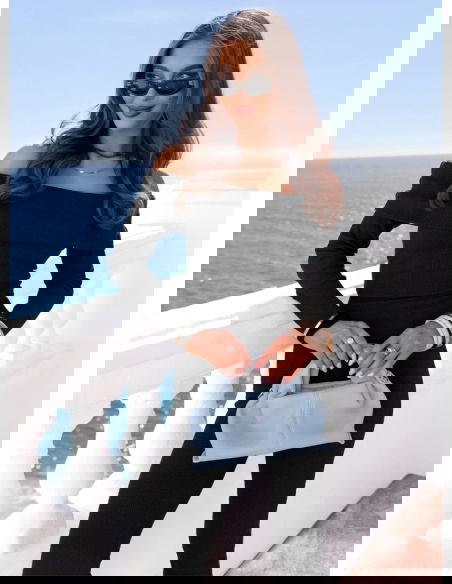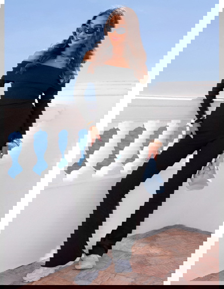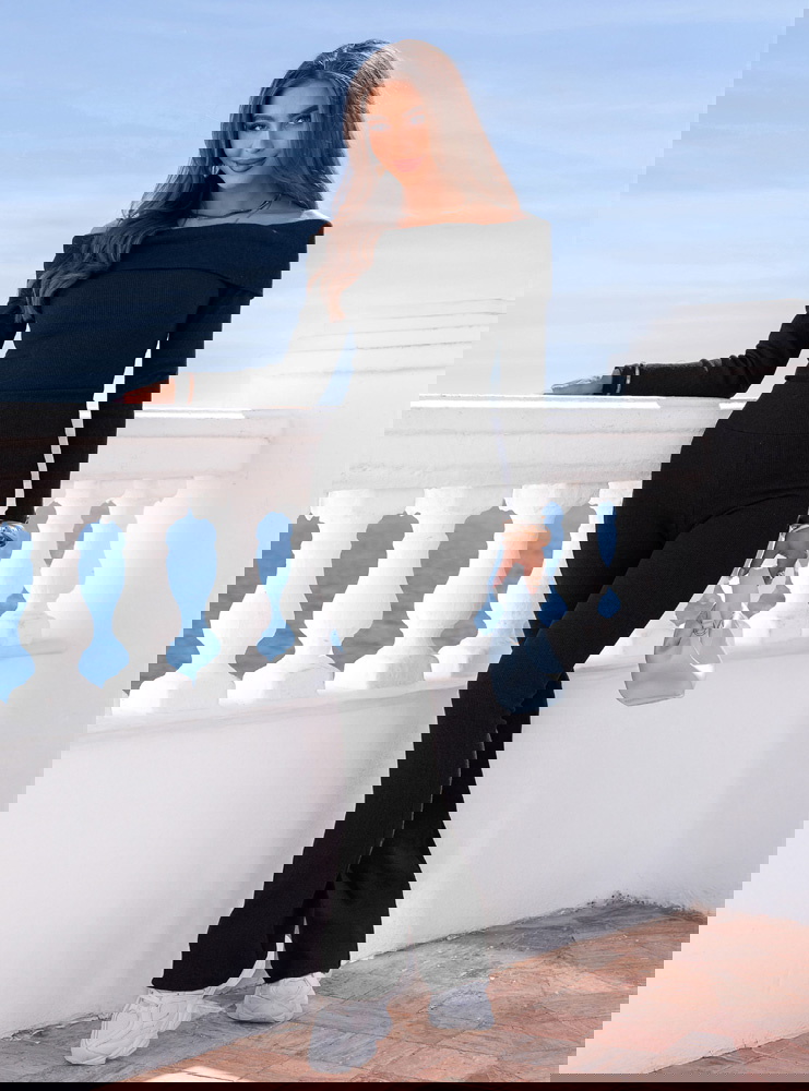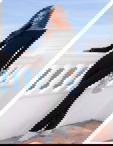 Czarny prążkowany komplet bluzka hiszpanka i spodnie Audrielle to dopasowany zestaw, który mocno podkreśla sylwetkę i nadaje jej wyrazistej linii. Klasyczna czerń sprawia, że komplet wygląda elegancko i ponadczasowo. Bluzka typu hiszpanka odsłania ramiona, eksponując obojczyki i dodając stylizacji kobiecego charakteru. Długie rękawy równoważą proporcje i sprawiają, że całość prezentuje się spójnie. Spodnie są dopasowane w biodrach i udach, a lekko rozszerzana nogawka optycznie wydłuża nogi. Prążkowany materiał elastycznie przylega do ciała i zapewnia wygodę noszenia. To model, który sprawdzi się zarówno w codziennych, jak i bardziej dopracowanych stylizacjach.