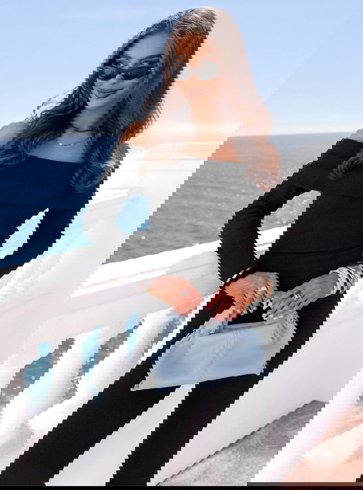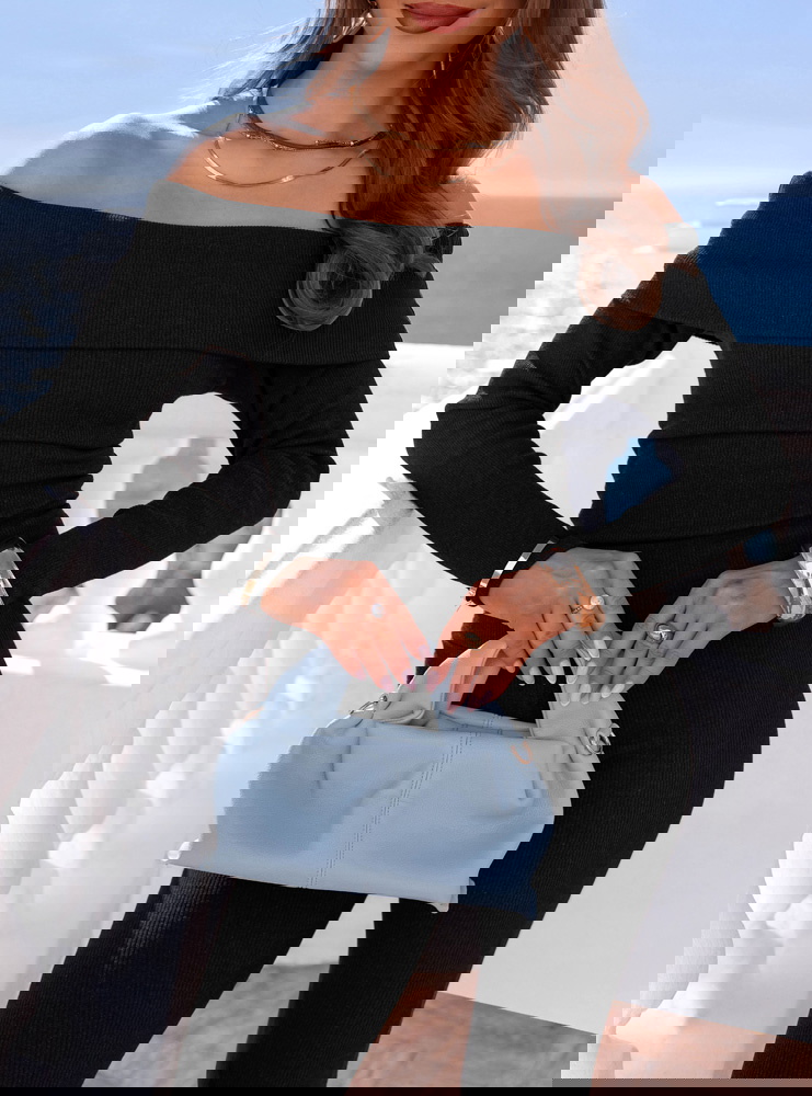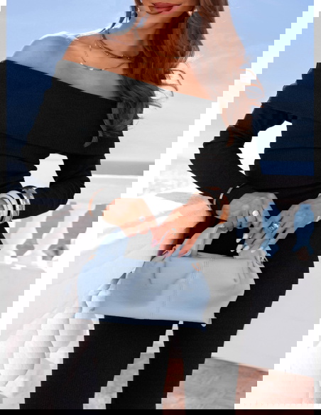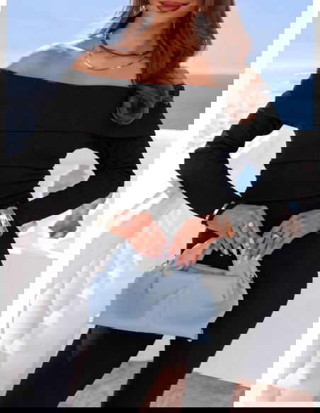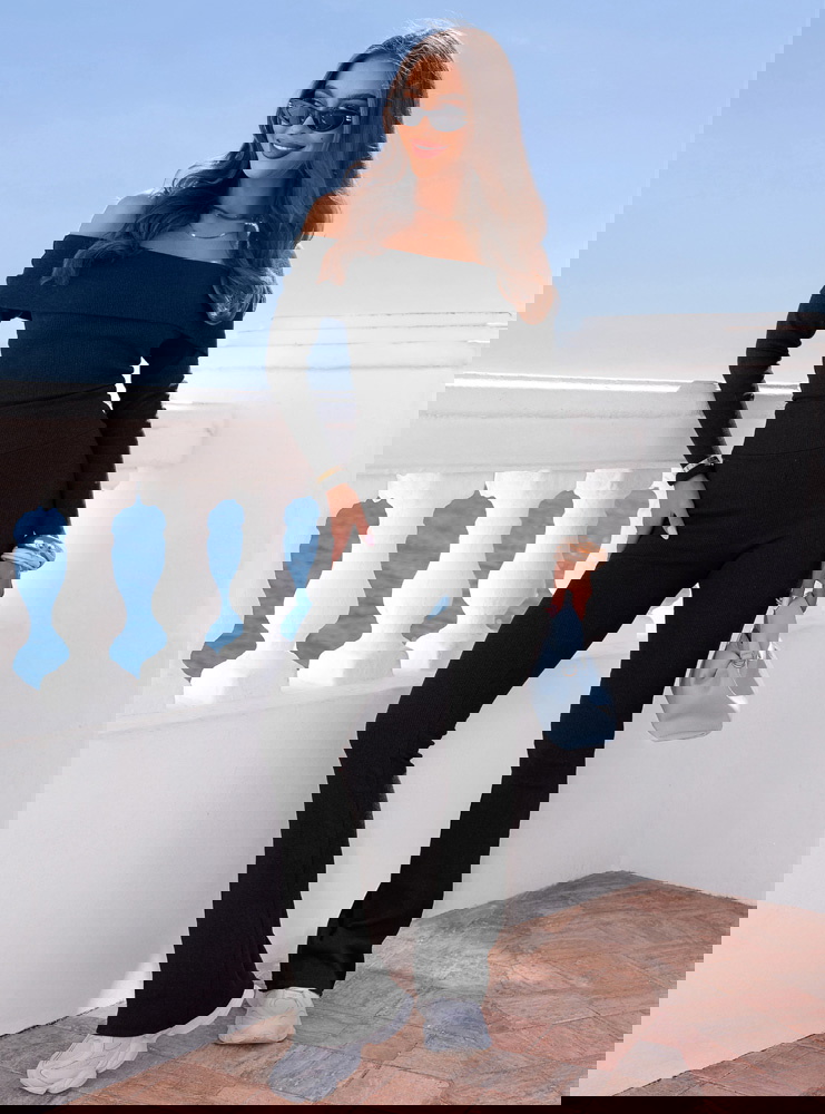 Dopasowany krój i odkryte ramiona tworzą elegancki, kobiecy zestaw w klasycznej czerni.