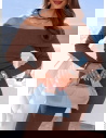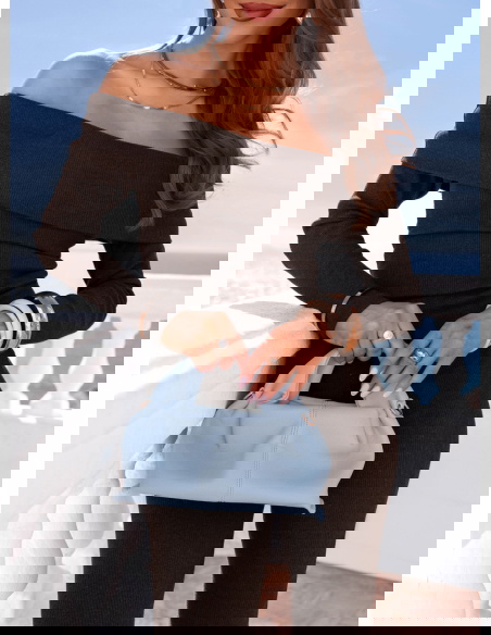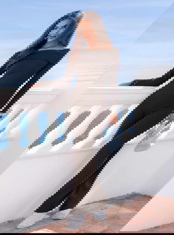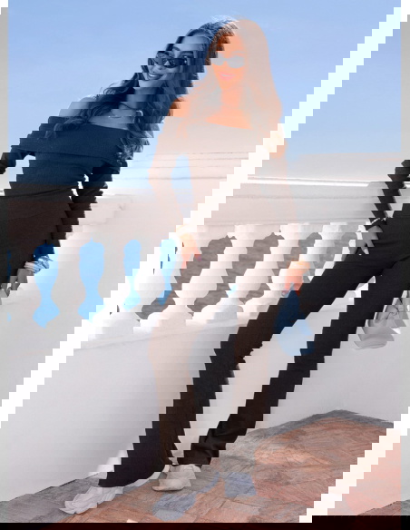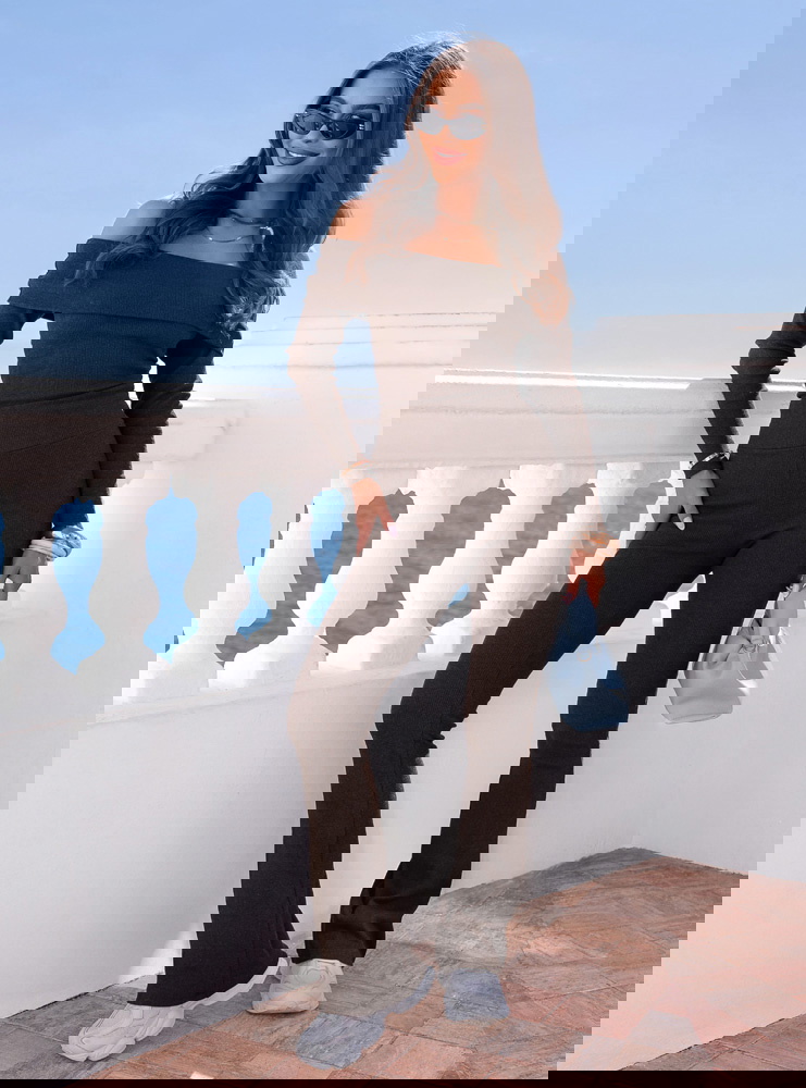 Czekoladowy prążkowany komplet bluzka hiszpanka i spodnie Audrielle to dopasowany zestaw, który mocno podkreśla kobiecą sylwetkę. Głęboki, czekoladowy odcień wygląda elegancko i nadaje całości wyrazistego charakteru. Bluzka typu hiszpanka odsłania ramiona i eksponuje obojczyki, dzięki czemu stylizacja zyskuje lekko zmysłowy akcent. Długi rękaw równoważy proporcje i sprawia, że komplet prezentuje się harmonijnie. Spodnie są dopasowane w górnej części, a lekko rozszerzana nogawka wydłuża nogi. Prążkowany materiał elastycznie przylega do ciała i zapewnia wygodę przez cały dzień. To model, który przyciąga uwagę prostą formą i mocnym kolorem.