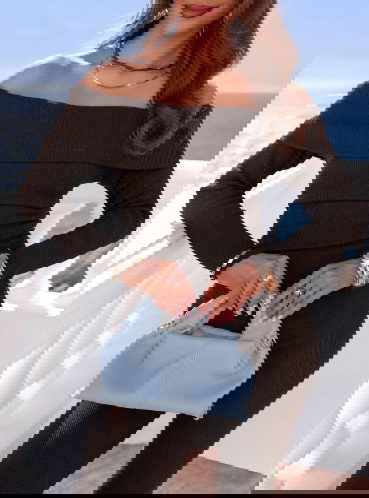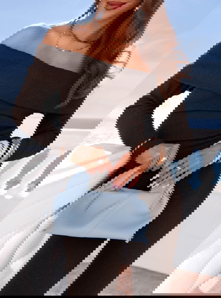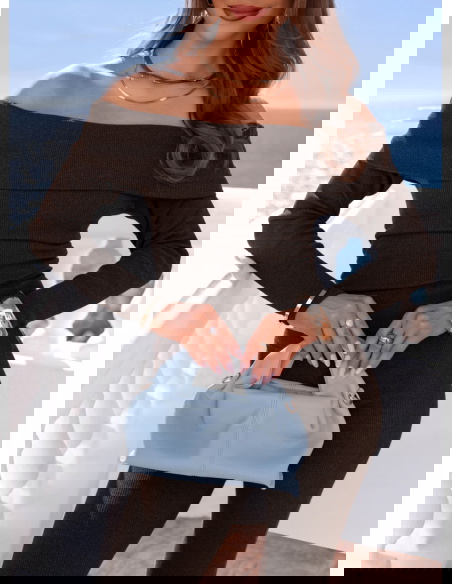Dopasowany krój i odkryte ramiona tworzą wyrazisty, kobiecy look w głębokim czekoladowym odcieniu.