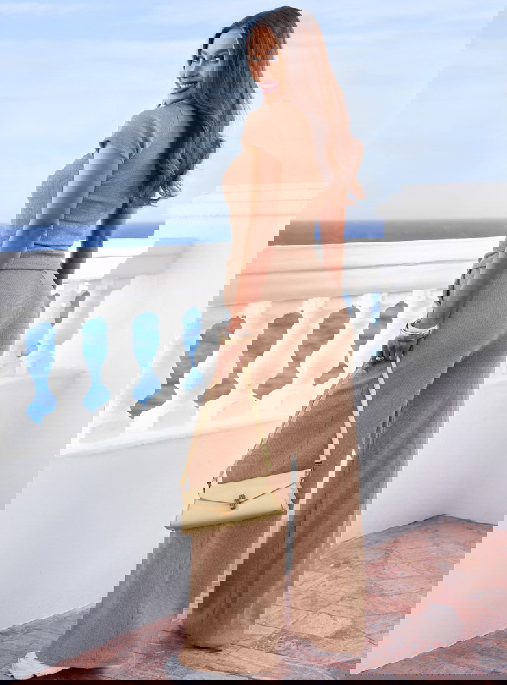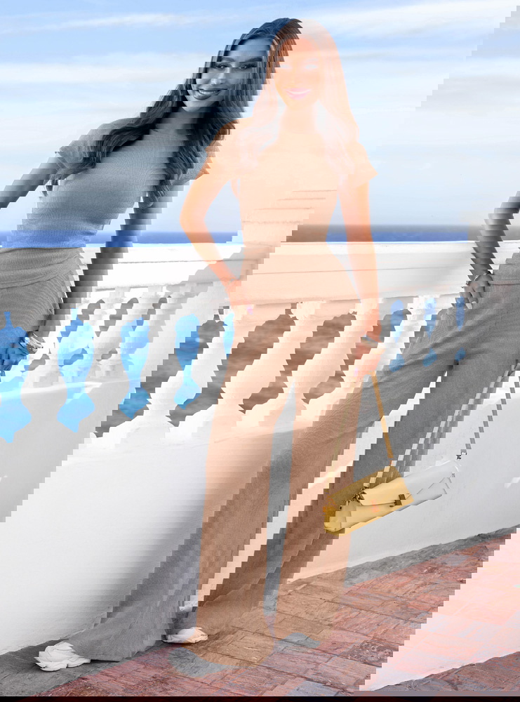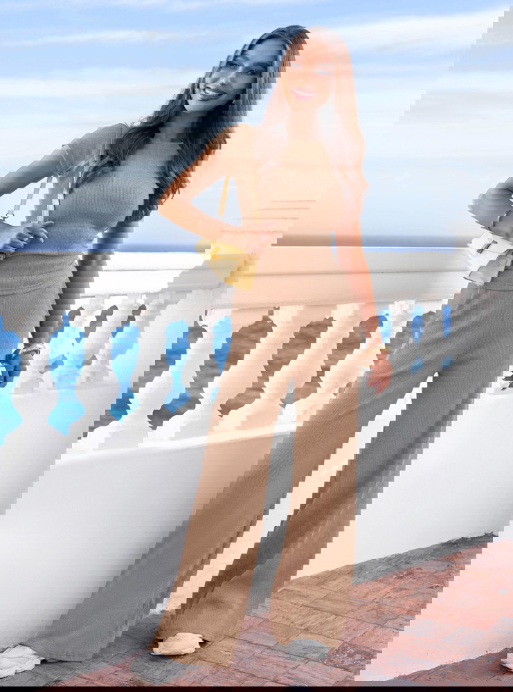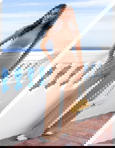 Prążkowany materiał, dopasowana bluzka i szerokie spodnie tworzą wygodny komplet w beżowym kolorze, który pięknie podkreśla sylwetkę.