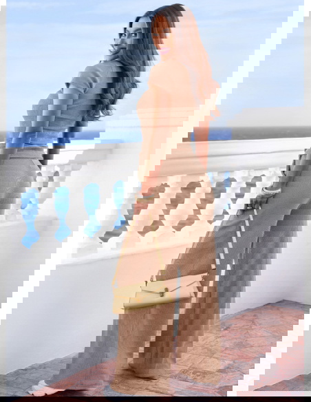 Beżowy prążkowany komplet bluzka i szerokie spodnie Maertisa to wygodny zestaw o kobiecym, dopracowanym kroju. Dopasowana bluzka z krótkim rękawem podkreśla sylwetkę i dzięki marszczeniom po bokach ładnie układa się w talii. Prążkowany materiał nadaje całości subtelnej struktury i sprawia, że komplet wygląda bardzo stylowo. Spodnie mają wysoki stan oraz szerokie nogawki, które pięknie wydłużają nogi i zapewniają swobodę ruchów. Elastyczna talia dobrze dopasowuje się do figury i zwiększa komfort noszenia. Beżowy kolor sprawia, że model wygląda lekko i ponadczasowo. To komplet, który sprawdzi się zarówno na co dzień, jak i podczas wyjazdu czy spotkania z przyjaciółmi.
