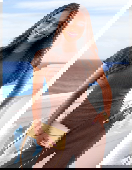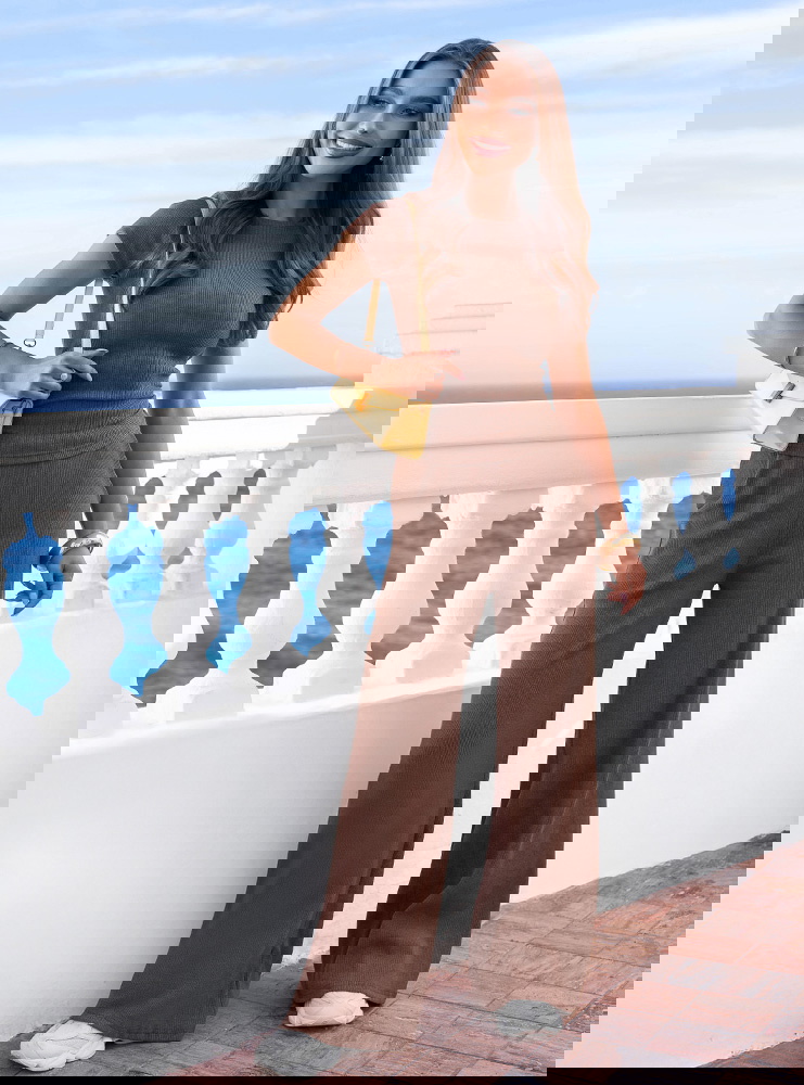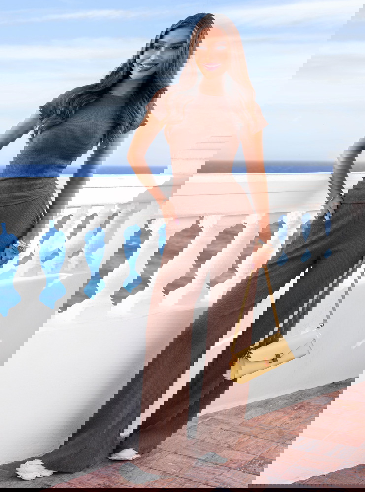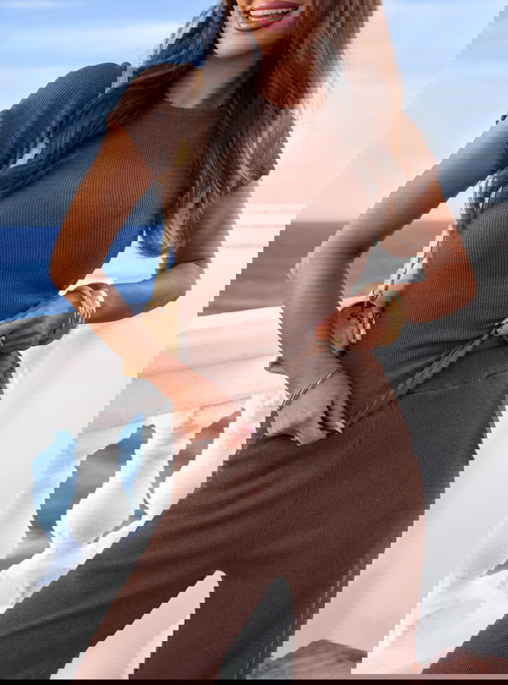 Prążkowany komplet bluzka i szerokie spodnie Maertisa - mocha mousse