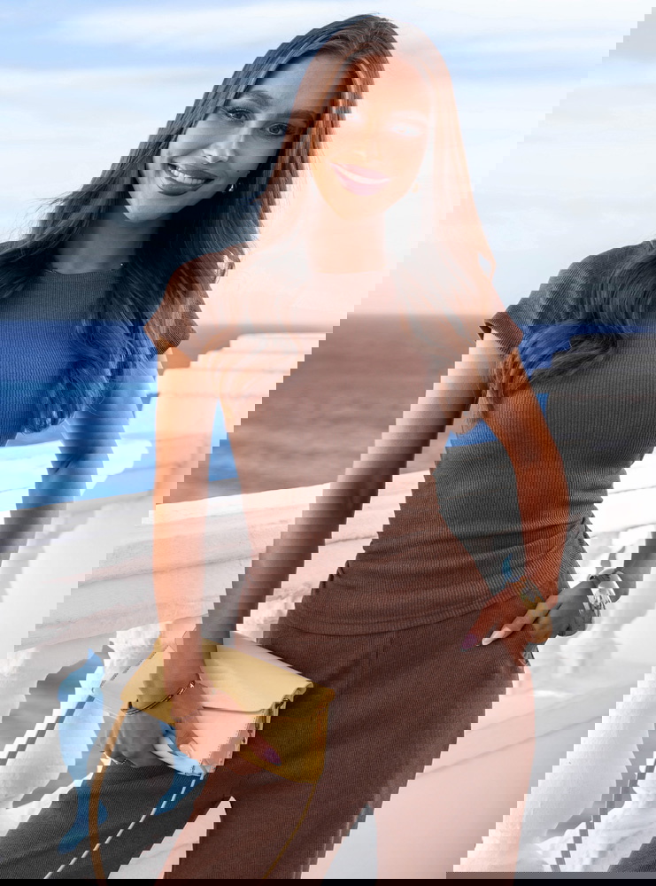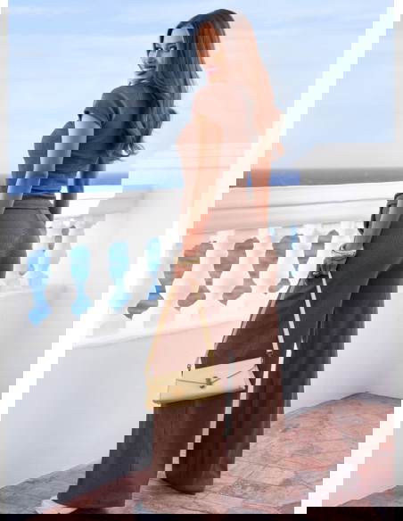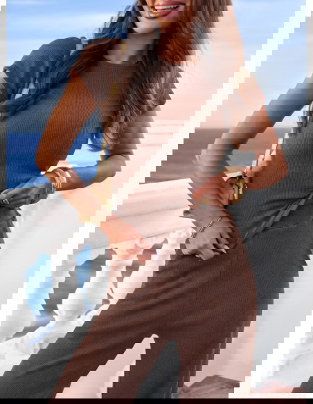 Prążkowany komplet bluzka i szerokie spodnie Maertisa – mocha mousse to wygodny zestaw o kobiecym kroju, który świetnie sprawdzi się w codziennych stylizacjach. Bluzka ma dopasowany fason i krótkie rękawy, dzięki czemu ładnie podkreśla sylwetkę. Marszczenia po bokach sprawiają, że materiał ciekawie układa się w talii i dodaje całości subtelnego charakteru. Prążkowana tkanina wygląda bardzo stylowo i nadaje kompletowi modnej struktury. Spodnie mają szerokie nogawki, które zapewniają swobodę ruchów i lekkość w stylizacji. Elastyczna talia dobrze dopasowuje się do figury, dzięki czemu komplet jest wygodny przez cały dzień. Kolor mocha mousse wygląda elegancko i sprawia, że zestaw prezentuje się bardzo stylowo.