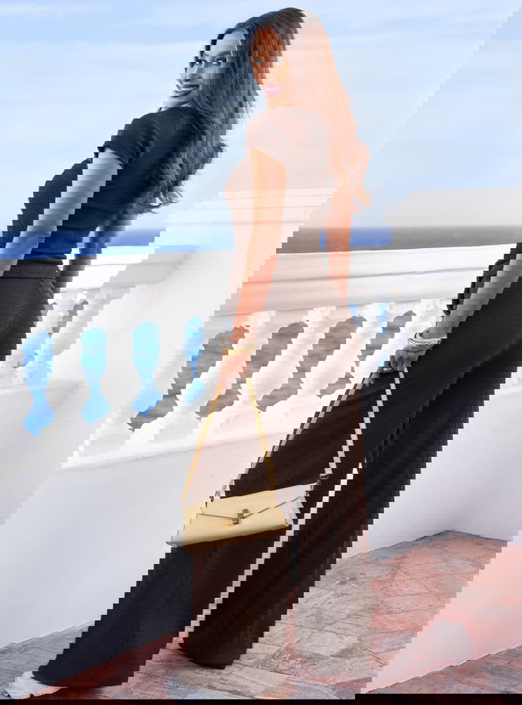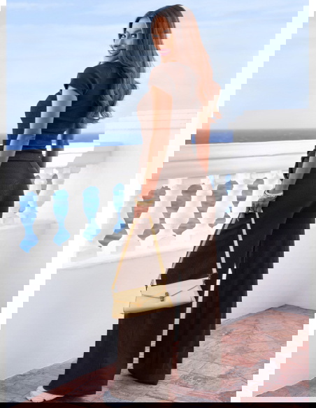 Na spacer – z klapkami i małą torebką.