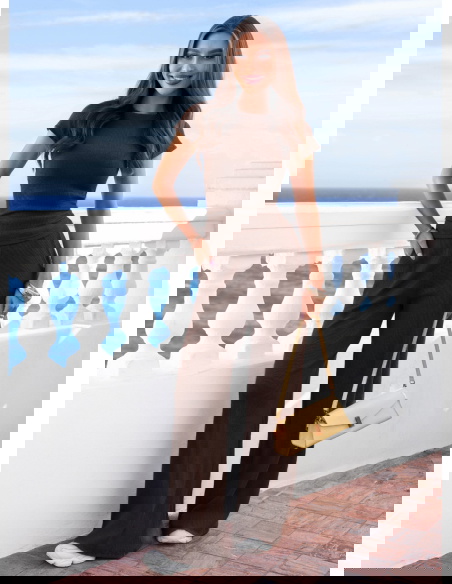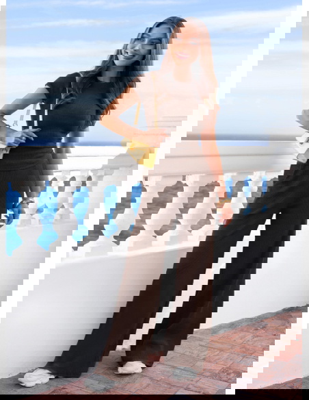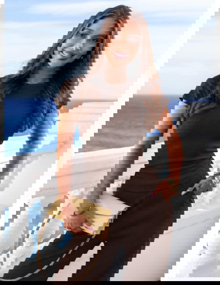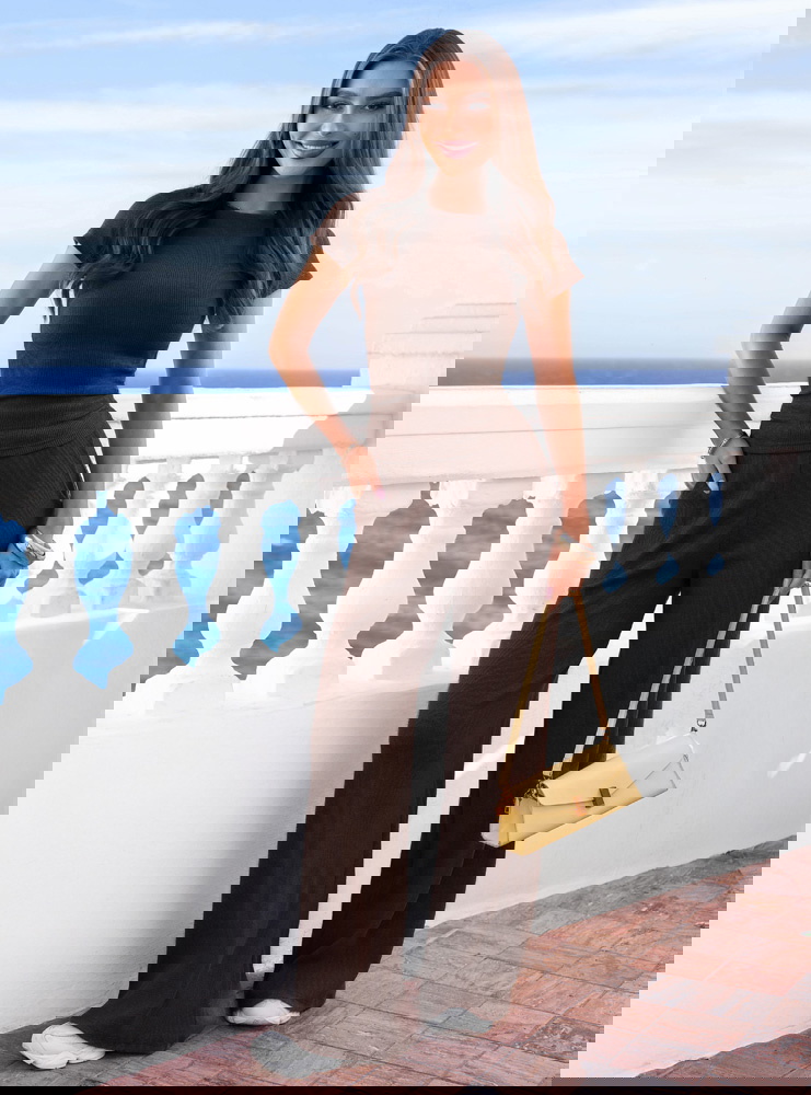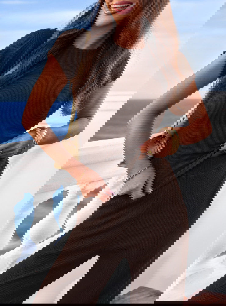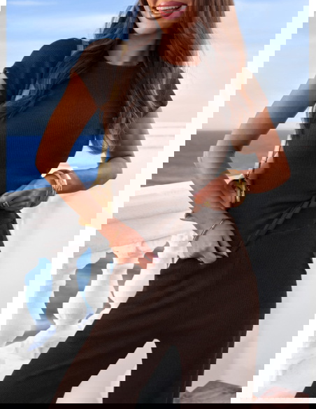 Czekoladowy prążkowany komplet bluzka i szerokie spodnie Maertisa to wygodny zestaw o dopracowanym kroju, który łączy komfort z kobiecym wyglądem. Bluzka ma dopasowany fason oraz krótkie rękawy, dzięki czemu dobrze podkreśla sylwetkę. Marszczenia po bokach sprawiają, że materiał ładnie układa się w talii i dodaje całości subtelnego charakteru. Prążkowana tkanina nadaje kompletowi modnej struktury i sprawia, że wygląda bardzo stylowo. Spodnie mają szerokie nogawki, które zapewniają swobodę ruchów i lekkość w stylizacji. Elastyczna talia dobrze dopasowuje się do figury i zwiększa wygodę noszenia. Czekoladowy kolor nadaje całości eleganckiego i ponadczasowego charakteru.