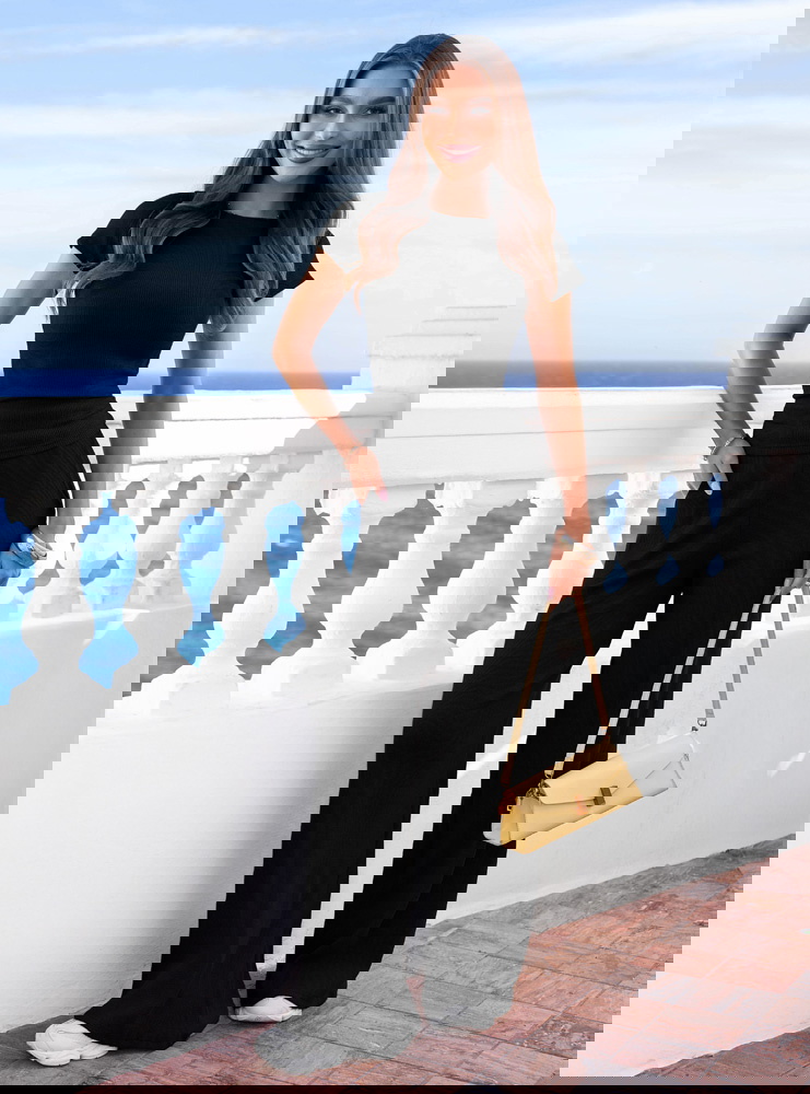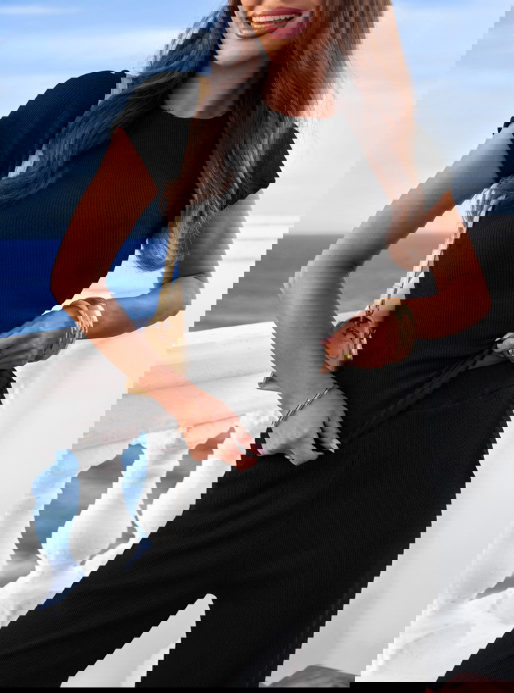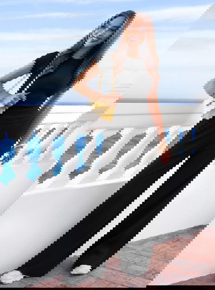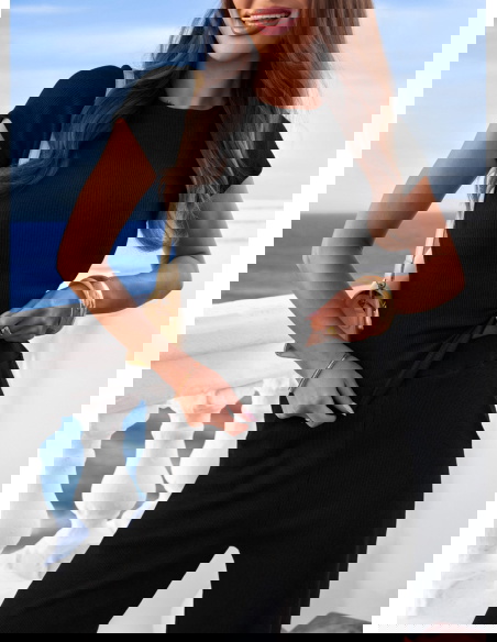 Czarny prążkowany komplet bluzka i szerokie spodnie Maertisa to stylowy zestaw, który łączy wygodę z kobiecym krojem. Bluzka ma dopasowany fason i krótkie rękawy, dzięki czemu dobrze podkreśla sylwetkę. Marszczenia po bokach sprawiają, że materiał ciekawie układa się w talii i dodaje całości subtelnego charakteru. Prążkowana tkanina nadaje kompletowi modnej struktury i sprawia, że wygląda bardzo elegancko. Spodnie mają szerokie nogawki, które zapewniają swobodę ruchów i lekkość podczas noszenia. Elastyczna talia dobrze dopasowuje się do figury i zwiększa komfort przez cały dzień. Czarny kolor nadaje zestawowi ponadczasowego charakteru i sprawia, że łatwo dopasować go do różnych stylizacji.