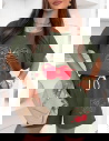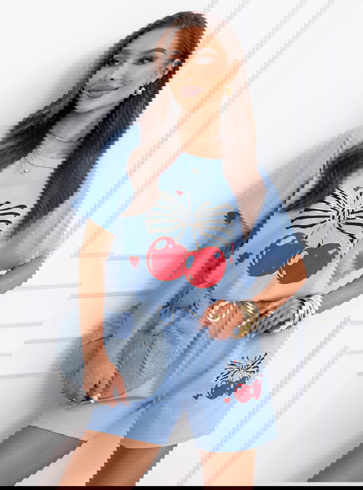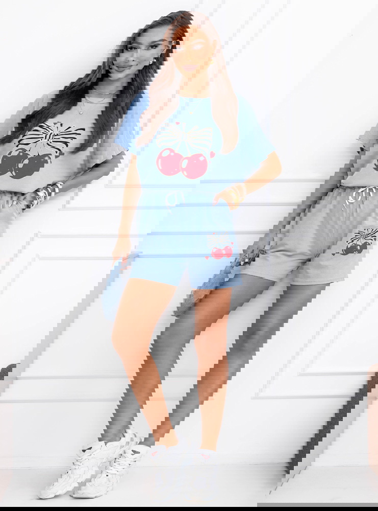 Błękitny komplet bluzka i krótkie spodenki Lamoyne to lekki i wygodny zestaw, który świetnie sprawdzi się w codziennych stylizacjach. Bluzka ma luźniejszy fason oraz krótki rękaw, dzięki czemu zapewnia komfort noszenia. Ozdobny nadruk z wiśniami i kokardą nadaje całości dziewczęcego charakteru i przyciąga uwagę. Krótkie spodenki mają wygodną talię ze sznurkiem do regulacji, co pozwala dopasować je do sylwetki. Swobodny krój sprawia, że komplet jest bardzo wygodny i idealny na cieplejsze dni. Materiał jest miękki i przyjemny w dotyku, dlatego świetnie sprawdzi się podczas codziennych aktywności. Błękitny kolor dodaje całości świeżości i letniego charakteru.