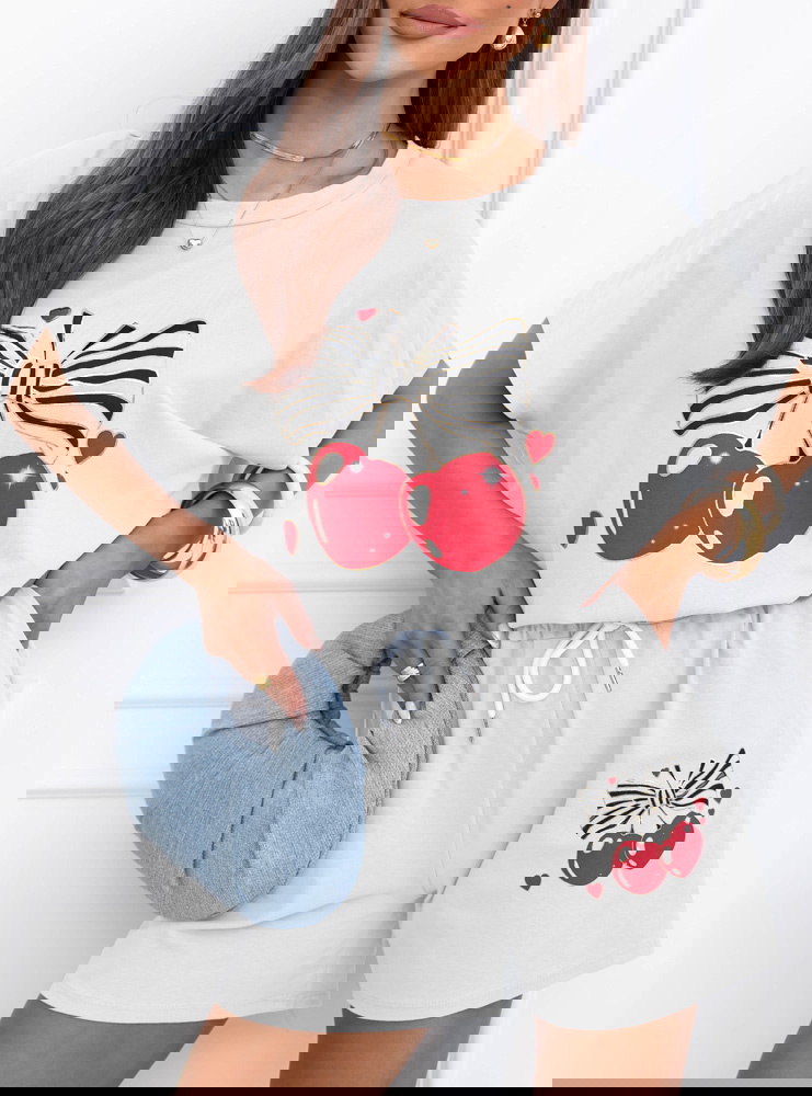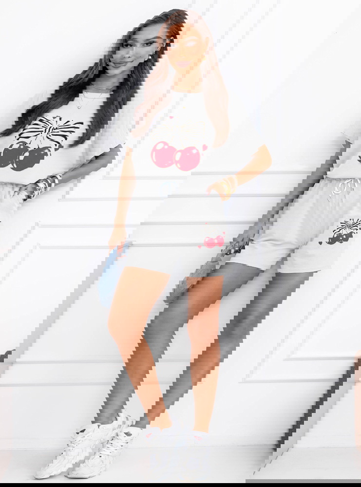 Biały komplet bluzka i krótkie spodenki Lamoyne to lekki zestaw, który świetnie sprawdzi się w codziennych stylizacjach. Bluzka ma luźny krój i krótki rękaw, dzięki czemu jest wygodna i dobrze układa się na sylwetce. Ozdobny nadruk z wiśniami i kokardą dodaje całości uroku i sprawia, że komplet wygląda bardzo dziewczęco. Krótkie spodenki mają elastyczną talię ze sznurkiem do regulacji, co pozwala łatwo dopasować je do figury. Swobodny fason zapewnia komfort i sprawia, że zestaw idealnie nadaje się na cieplejsze dni. Materiał jest miękki i przyjemny w dotyku, dlatego świetnie sprawdzi się w codziennym noszeniu. Biały kolor sprawia, że komplet wygląda świeżo i bardzo lekko.