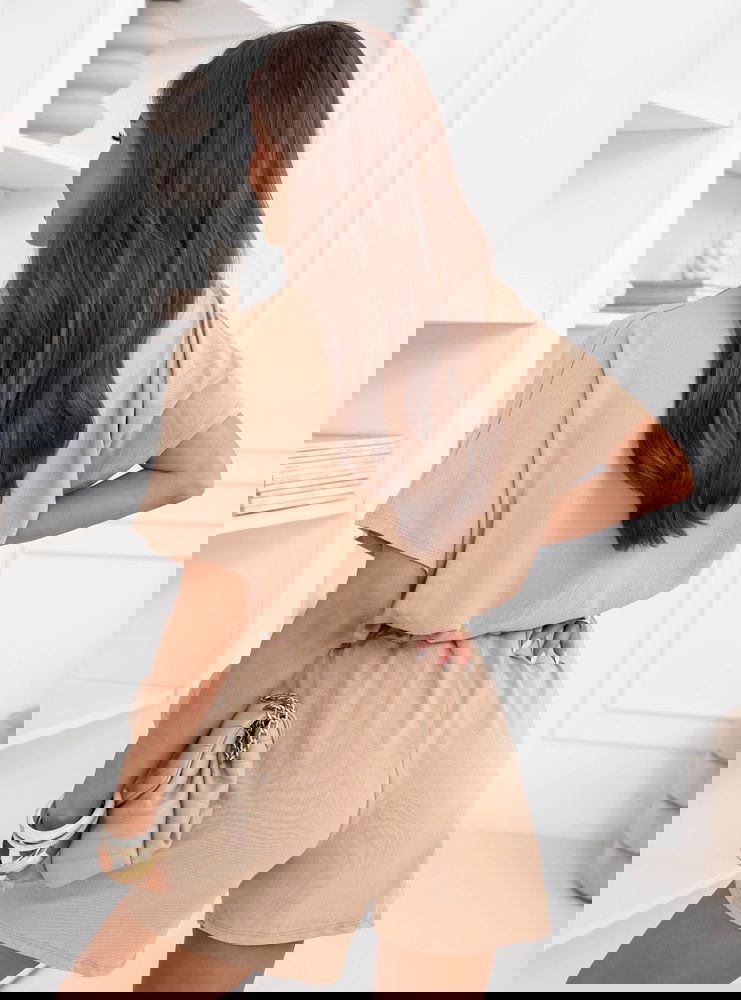 Lekki komplet w beżowym kolorze, który świetnie sprawdzi się w wygodnych, letnich stylizacjach.