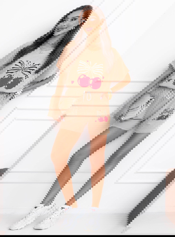 Beżowy komplet bluzka i krótkie spodenki Lamoyne to wygodny zestaw, który idealnie sprawdzi się w codziennych stylizacjach. Bluzka ma luźny krój i krótki rękaw, dlatego zapewnia swobodę i komfort noszenia. Ozdobny nadruk z wiśniami i kokardą nadaje całości dziewczęcego charakteru i sprawia, że komplet wygląda bardzo stylowo. Krótkie spodenki mają elastyczną talię ze sznurkiem do regulacji, co pozwala łatwo dopasować je do sylwetki. Luźniejszy fason sprawia, że zestaw jest wygodny i dobrze sprawdzi się w cieplejsze dni. Materiał jest miękki i przyjemny w dotyku, dlatego komplet świetnie nadaje się do codziennego noszenia. Beżowy kolor sprawia, że model wygląda subtelnie i łatwo dopasować go do różnych dodatków.