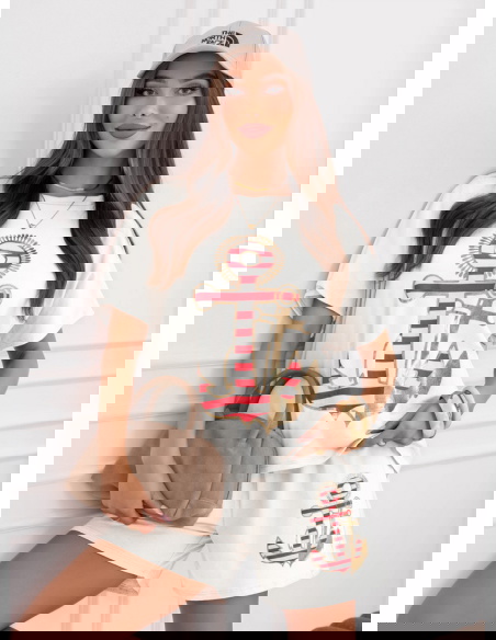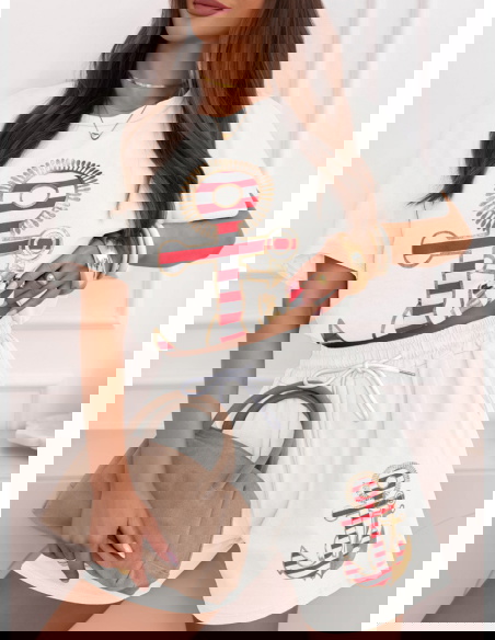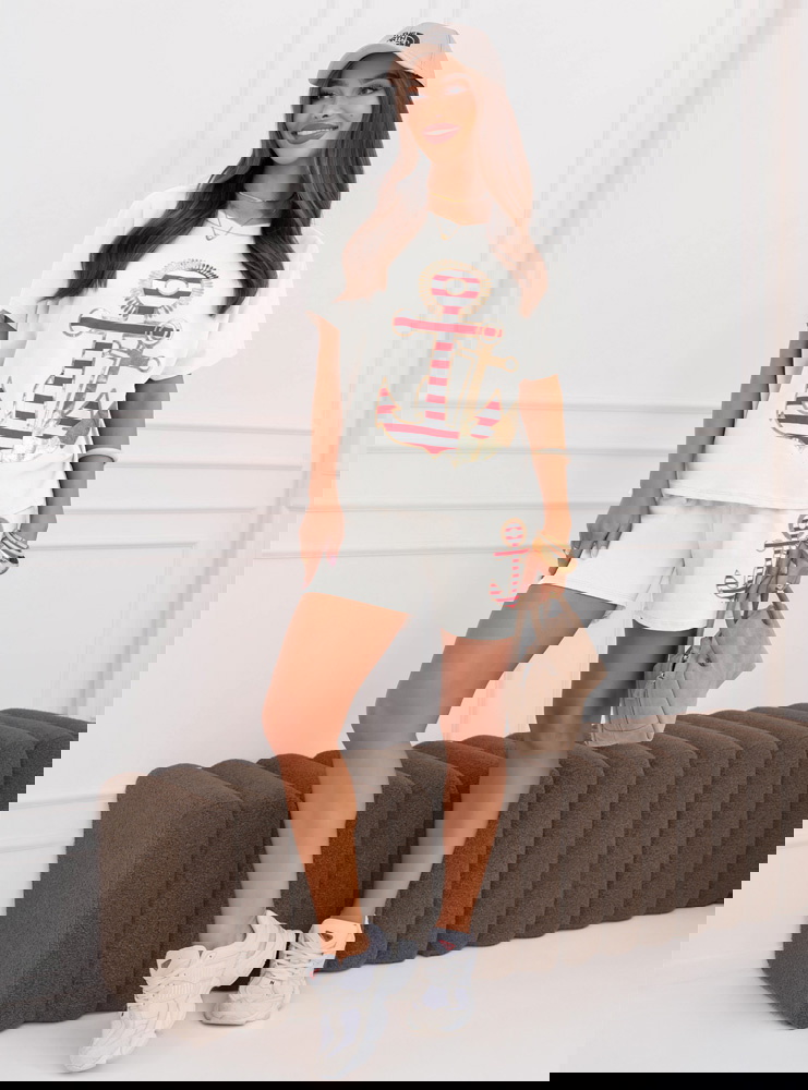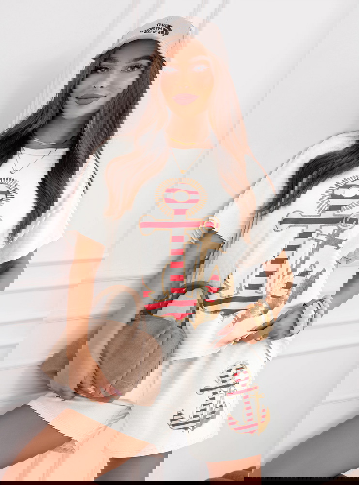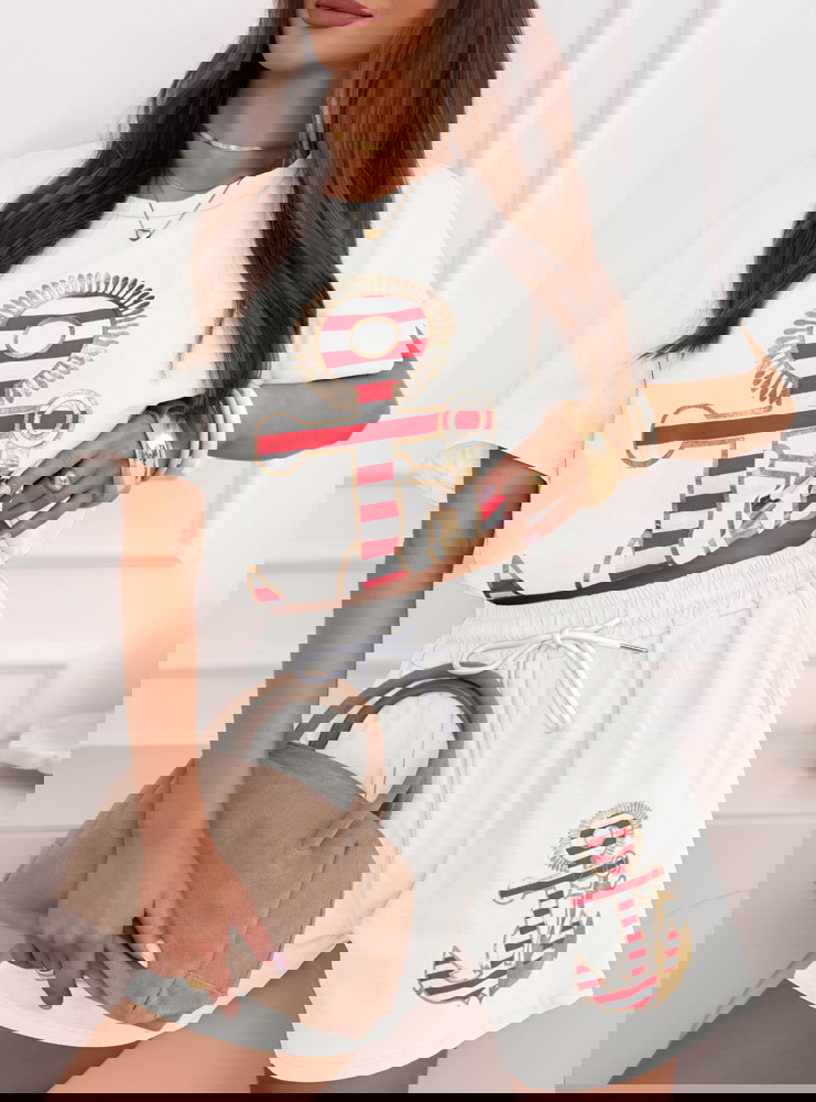 Biały komplet bluzka i spodenki Joellianee to wygodny zestaw, który świetnie sprawdzi się w codziennych, letnich stylizacjach. Bluzka ma luźniejszy fason i krótki rękaw, dzięki czemu zapewnia komfort noszenia i swobodę ruchów. Na przodzie znajduje się ozdobny nadruk z motywem kotwicy, który nadaje całości wakacyjnego charakteru. Spodenki mają elastyczną talię ze sznurkiem, dlatego dobrze dopasowują się do sylwetki. Krótszy krój sprawia, że komplet wygląda lekko i bardzo dziewczęco. Materiał jest miękki i przyjemny w dotyku, dlatego idealnie sprawdzi się podczas cieplejszych dni. Biały kolor dodaje stylizacji świeżości i pasuje do wielu dodatków.