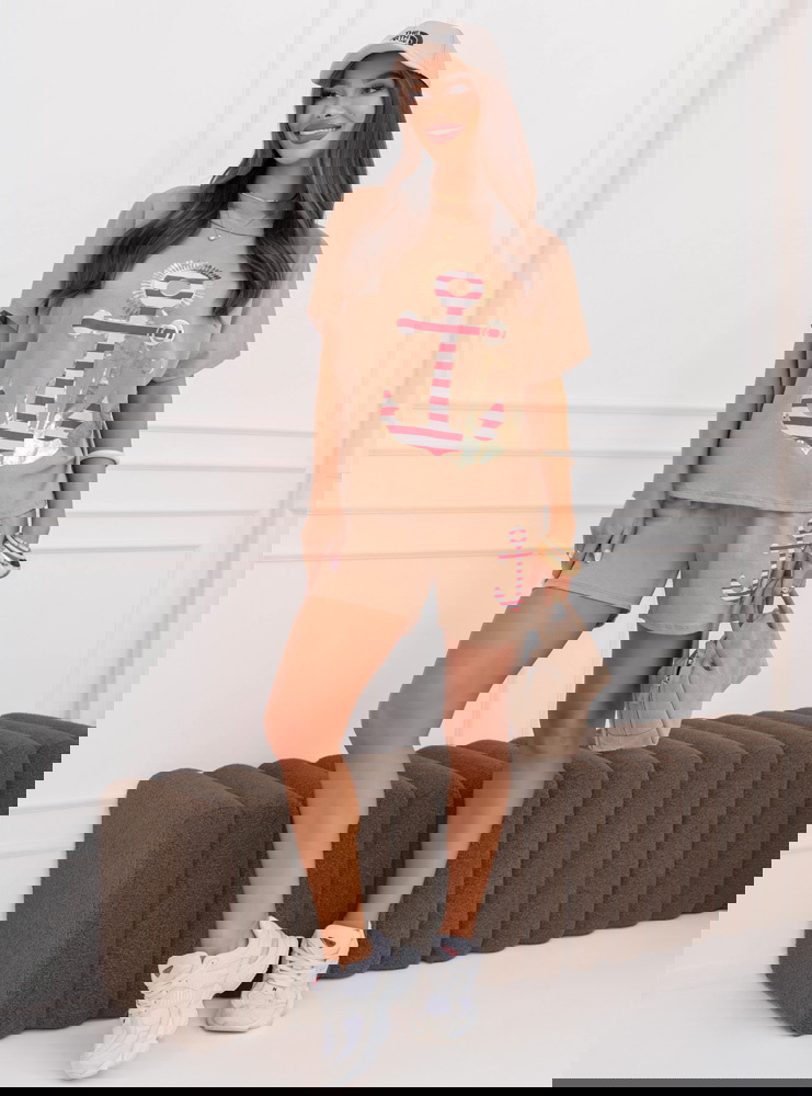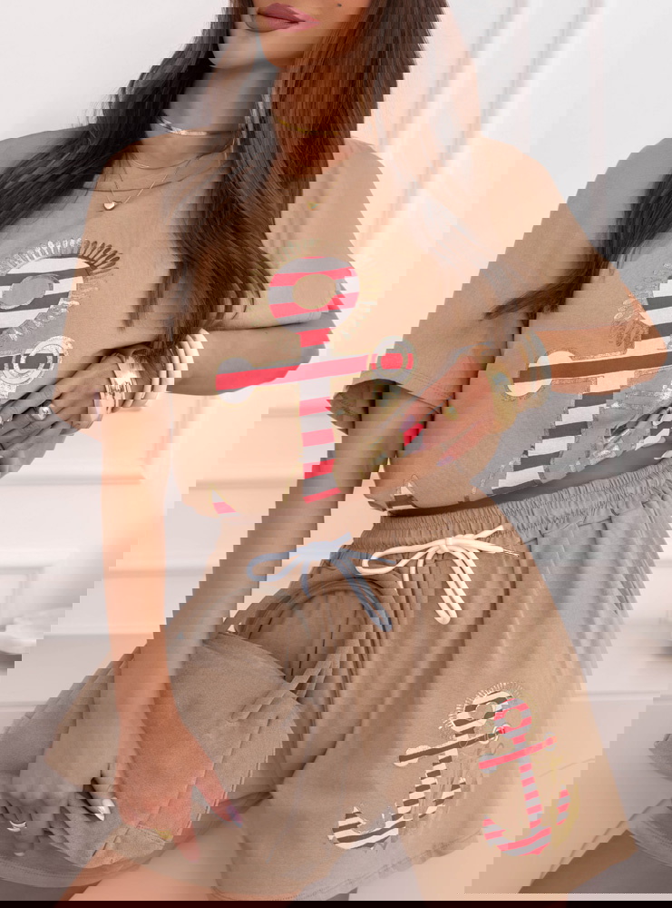 Komplet bluzka i spodenki Joellianee – mocha mousse to wygodny zestaw, który świetnie sprawdzi się w codziennych stylizacjach. Bluzka ma luźny fason i krótki rękaw, dzięki czemu zapewnia komfort noszenia i swobodę ruchów. Na przodzie znajduje się efektowny nadruk z motywem kotwicy, który nadaje całości modnego, wakacyjnego charakteru. Spodenki mają elastyczną talię ze sznurkiem, dlatego dobrze dopasowują się do sylwetki. Krótszy fason sprawia, że komplet wygląda lekko i bardzo swobodnie. Materiał jest miękki i przyjemny w dotyku, dlatego świetnie sprawdzi się podczas cieplejszych dni. Kolor mocha mousse nadaje stylizacji modnego i eleganckiego charakteru.