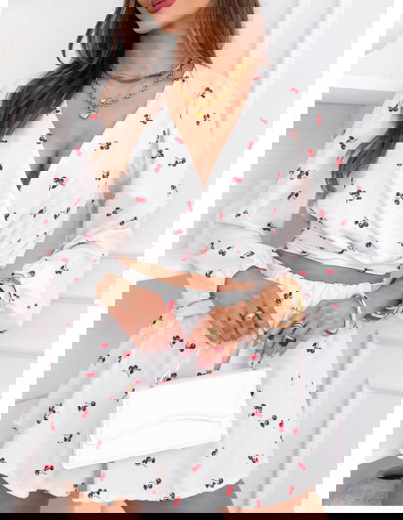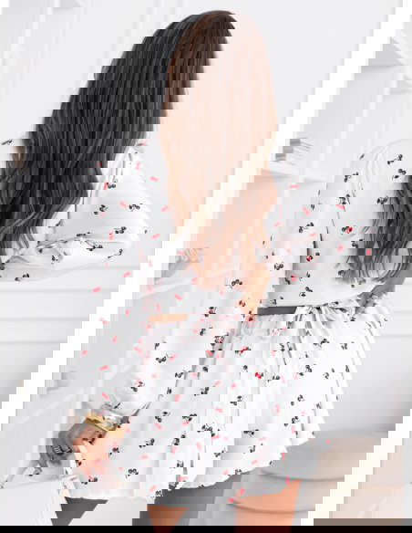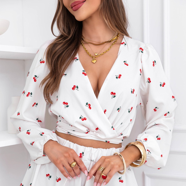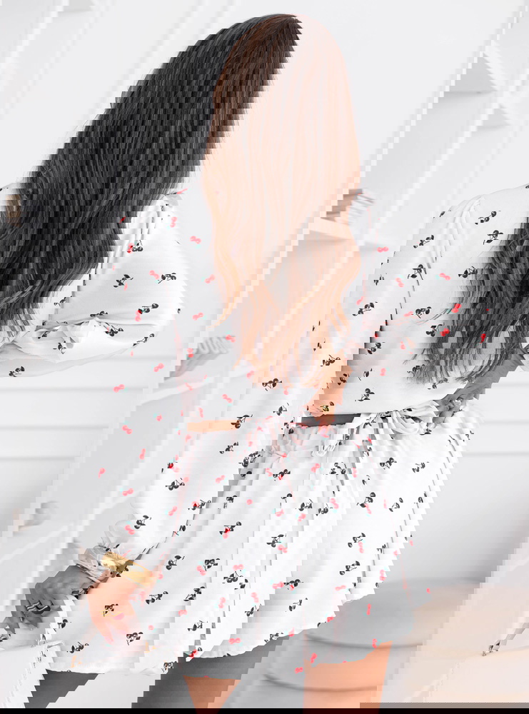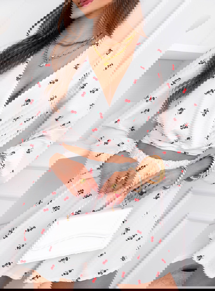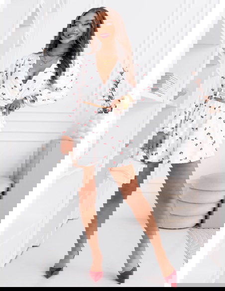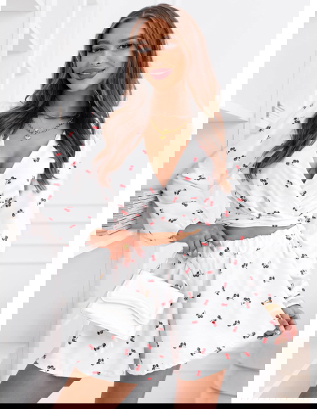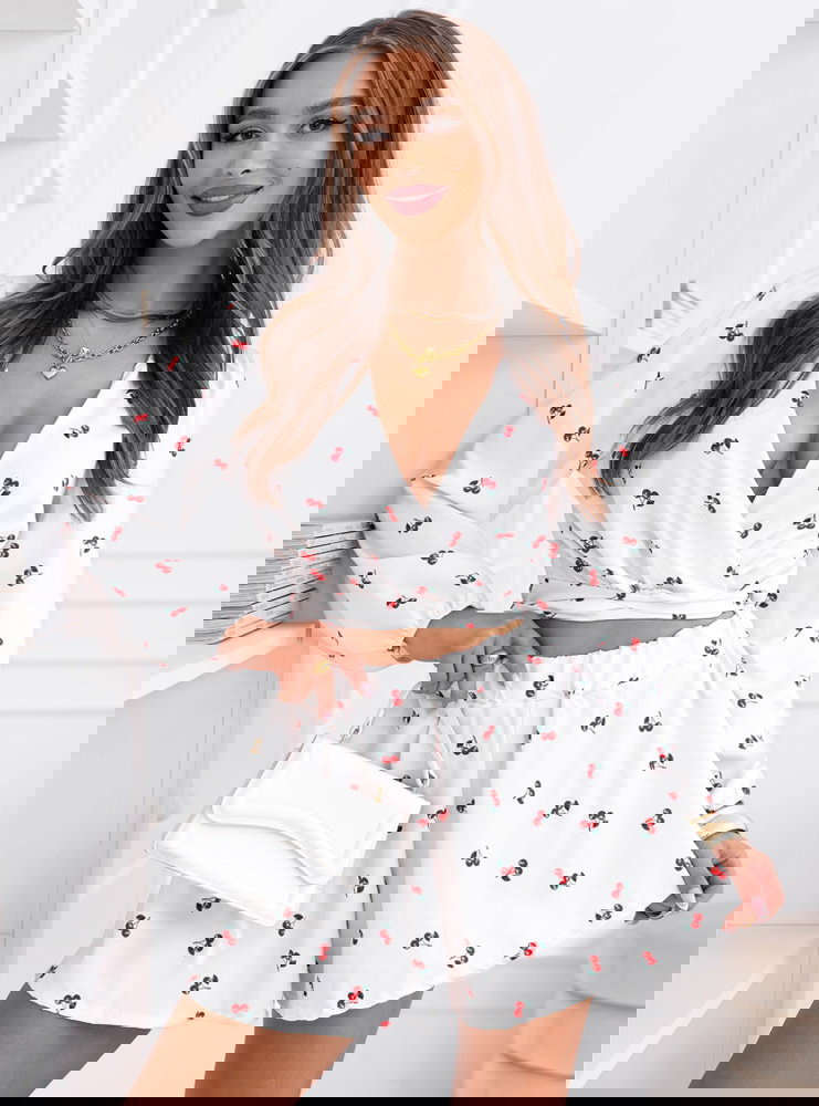 Wzorzysty komplet top i spodenki Sheilah – wzór 7 to lekki i bardzo dziewczęcy model, który świetnie sprawdzi się w letnich stylizacjach. Komplet składa się z krótkiego topu z przekładanym dekoltem oraz zwiewnych spodenek o luźniejszym kroju. Góra pięknie podkreśla linię dekoltu i talię, dzięki czemu całość prezentuje się bardzo kobieco. Długie rękawy zakończone delikatnym marszczeniem dodają stylizacji lekkości i subtelnej elegancji. Spodenki posiadają wygodną gumkę w talii, która zapewnia komfort noszenia i dobre dopasowanie do sylwetki. Lekki materiał sprawia, że komplet pięknie układa się w ruchu i jest bardzo wygodny. Delikatny wzór w wisienki nadaje stylizacji uroczego i świeżego charakteru.