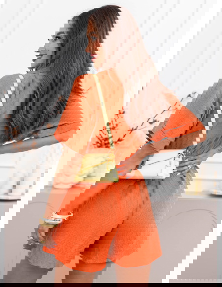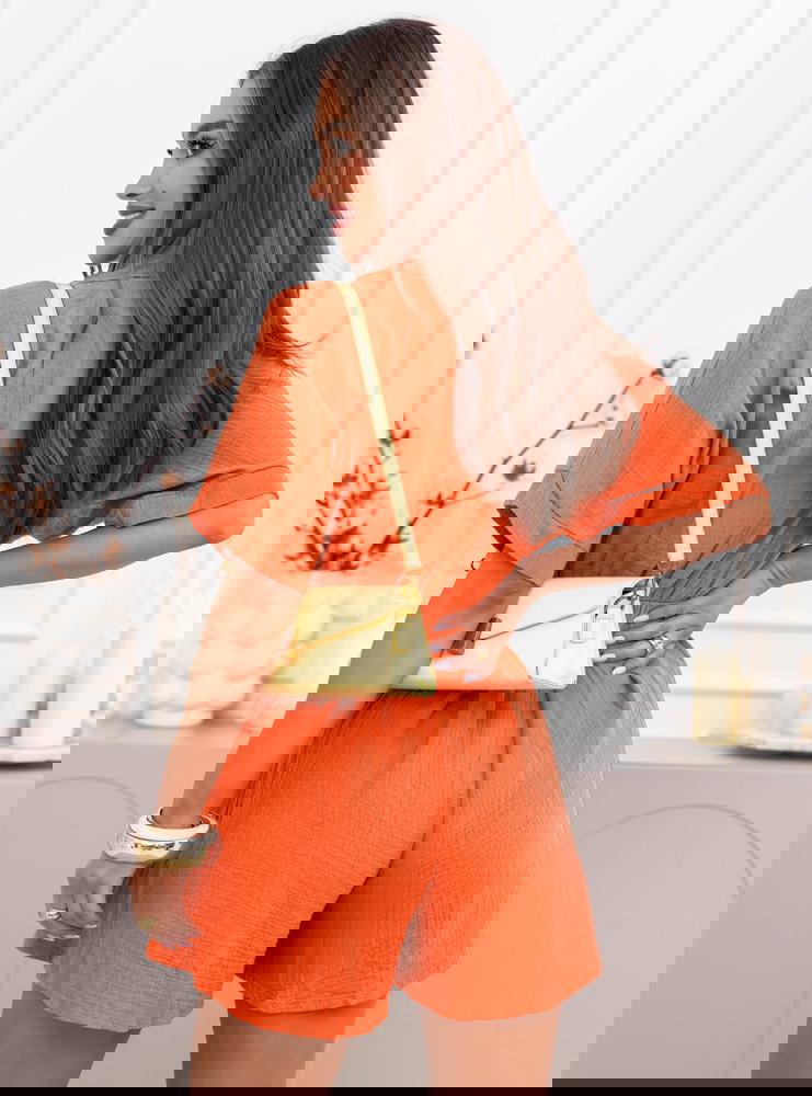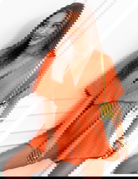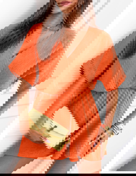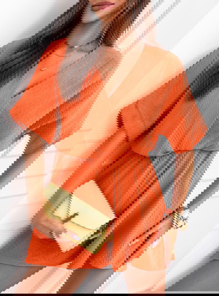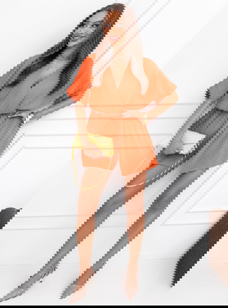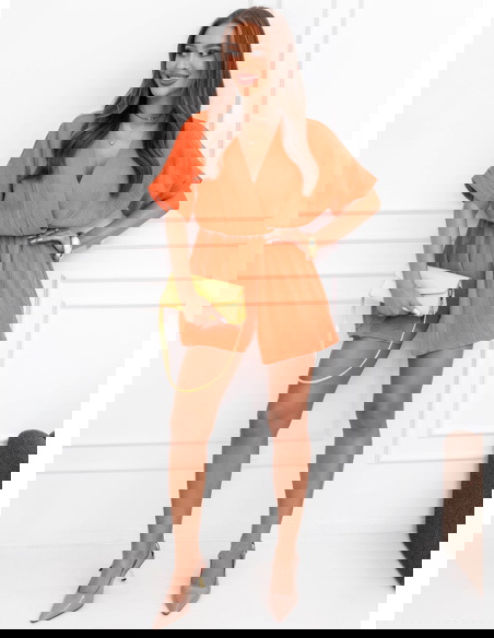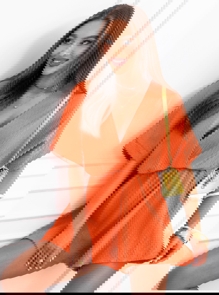 Pomarańczowy muślinowy kombinezon z przekładanym dekoltem Lokkia
