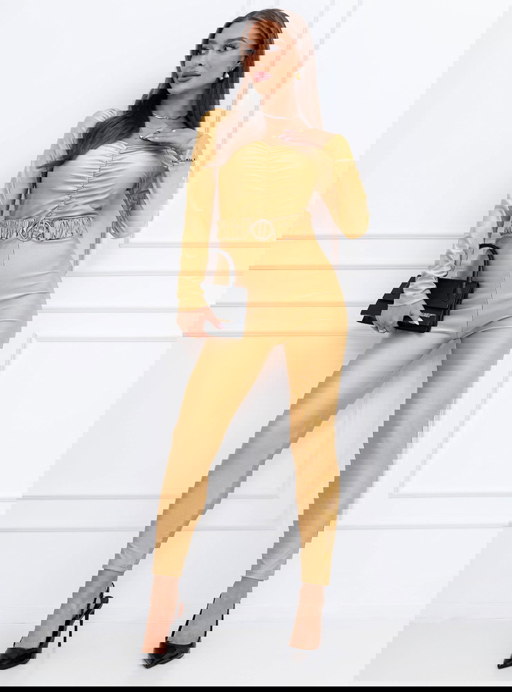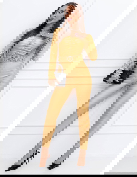Beżowy kombinezon z ozdobnym paskiem Madilynn to efektowny model, który pięknie podkreśla sylwetkę i przyciąga uwagę dopracowanymi detalami. Dopasowany krój podkreśla figurę i nadaje stylizacji kobiecego charakteru. Delikatne marszczenie na przodzie dodaje całości modnego wyrazu i subtelnie modeluje górną część sylwetki. Długie rękawy sprawiają, że model wygląda elegancko i świetnie sprawdzi się również w chłodniejsze dni. W talii znajduje się ozdobny pasek, który podkreśla figurę i stanowi stylowy akcent całej stylizacji. Zwężane nogawki sprawiają, że sylwetka wygląda smukło i proporcjonalnie. Beżowy kolor jest ponadczasowy i bardzo elegancki, dzięki czemu kombinezon prezentuje się wyjątkowo stylowo. To model, który tworzy gotową stylizację na wiele okazji.