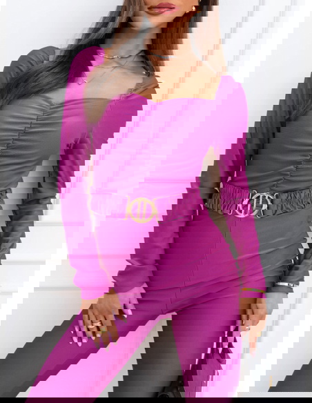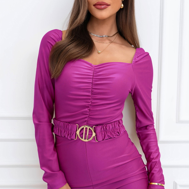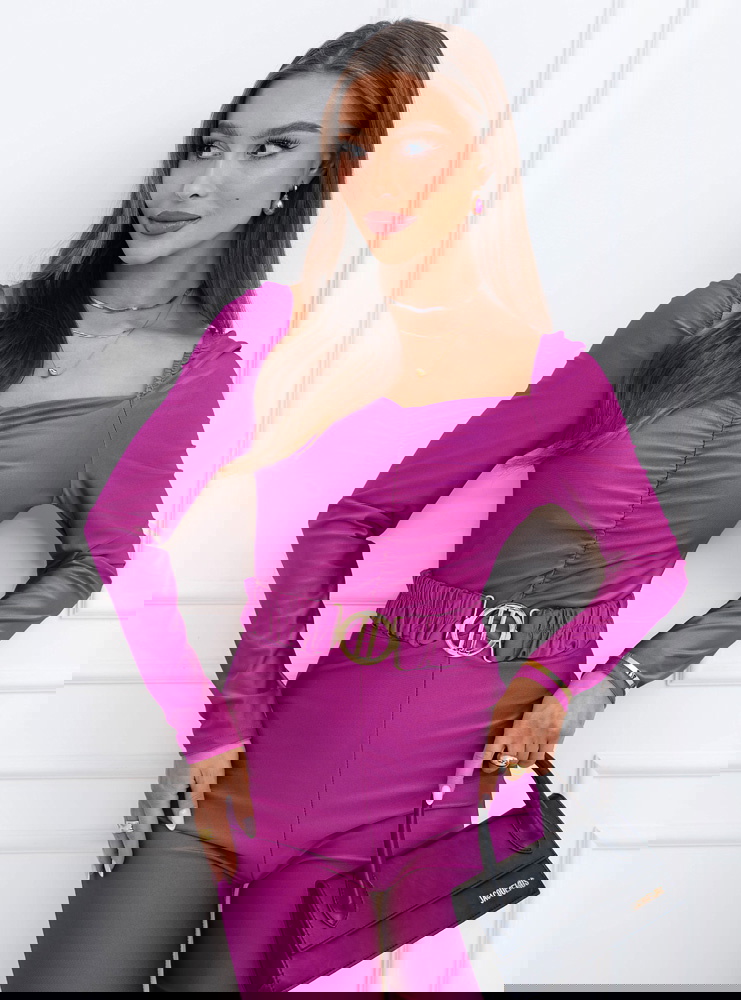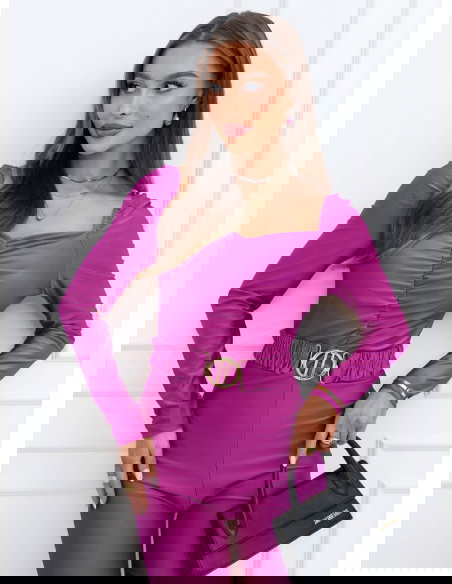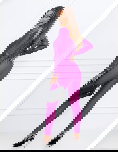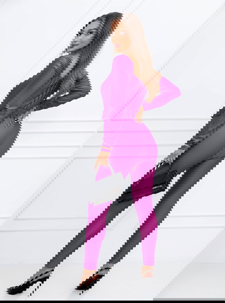 Fioletowy kombinezon z ozdobnym paskiem Madilynn to odważna i bardzo kobieca propozycja, która przyciąga uwagę intensywnym kolorem i dopasowanym krojem. Model pięknie podkreśla sylwetkę i nadaje stylizacji wyrazistego charakteru. Delikatne marszczenie na przodzie dodaje całości modowego akcentu i subtelnie modeluje górną część figury. Długie rękawy sprawiają, że kombinezon wygląda elegancko i stylowo. W talii znajduje się ozdobny pasek, który podkreśla figurę i stanowi efektowny detal całej stylizacji. Dopasowane nogawki wysmuklają nogi i podkreślają kobiecy charakter modelu. Fioletowy kolor sprawia, że kombinezon prezentuje się wyjątkowo i przyciąga spojrzenia. To model, który idealnie sprawdzi się na wieczorne wyjścia i wyjątkowe okazje.