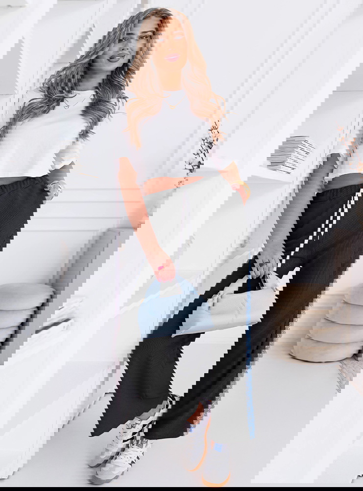 Na co dzień – z klasyczną bluzką i torebką na ramię.