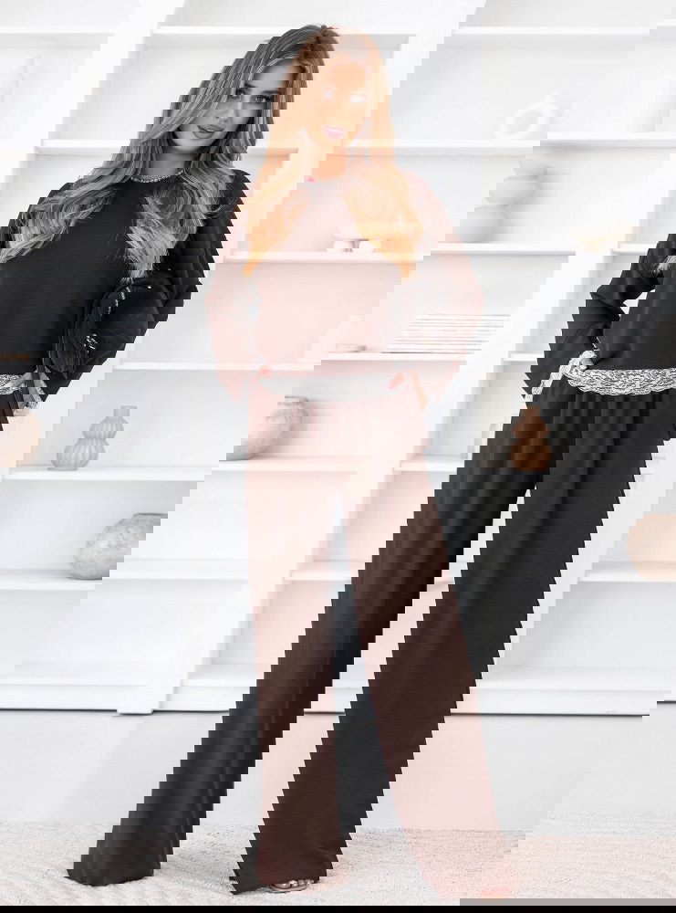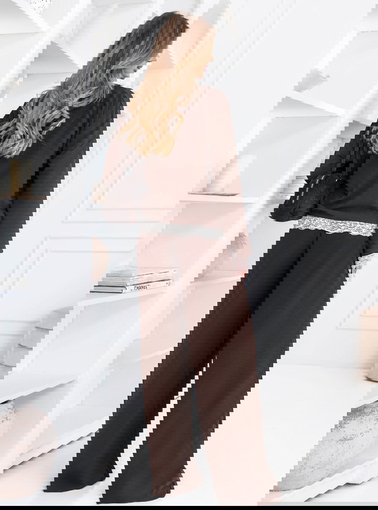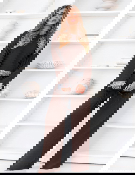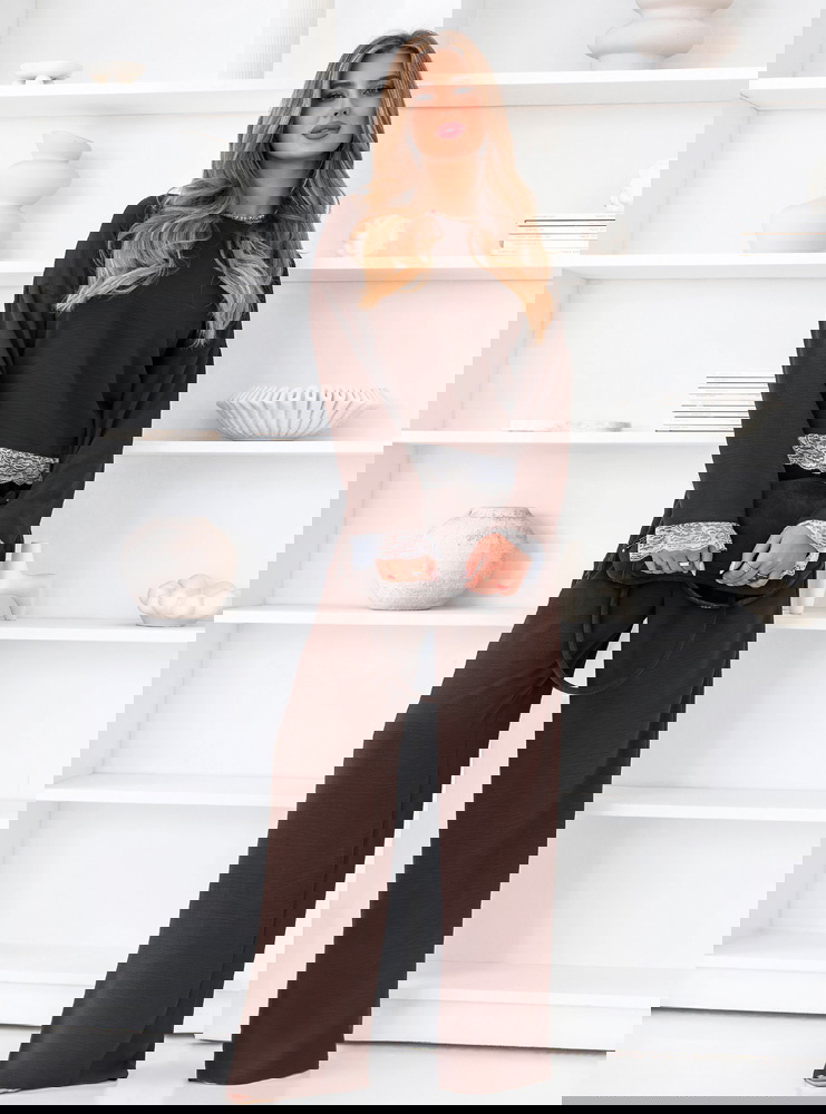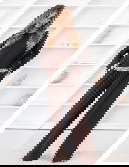 Czekoladowy komplet z koronkowymi wstawkami bluzka i szerokie spodnie Aubrielia przyciąga uwagę głębokim kolorem i dopracowanymi detalami. Czekoladowy odcień sprawia, że całość wygląda elegancko, ale jednocześnie pozostaje bardzo uniwersalna. Bluzka ma prosty, luźny fason, który dobrze układa się na sylwetce i daje dużą swobodę ruchów. Długie rękawy zakończone są koronką, która nadaje całości delikatniejszego charakteru. Koronkowe wykończenie pojawia się również u dołu bluzki, subtelnie przełamując minimalistyczny krój. Spodnie mają szerokie nogawki, dzięki czemu tworzą lekką, płynną linię sylwetki. Wysoki stan sprawia, że komplet prezentuje się proporcjonalnie i bardzo stylowo. Materiał jest miękki i komfortowy, dlatego zestaw świetnie sprawdzi się w codziennym noszeniu.