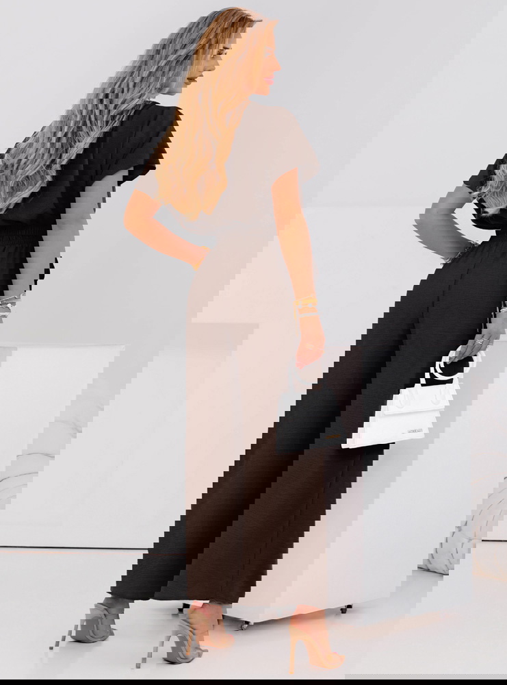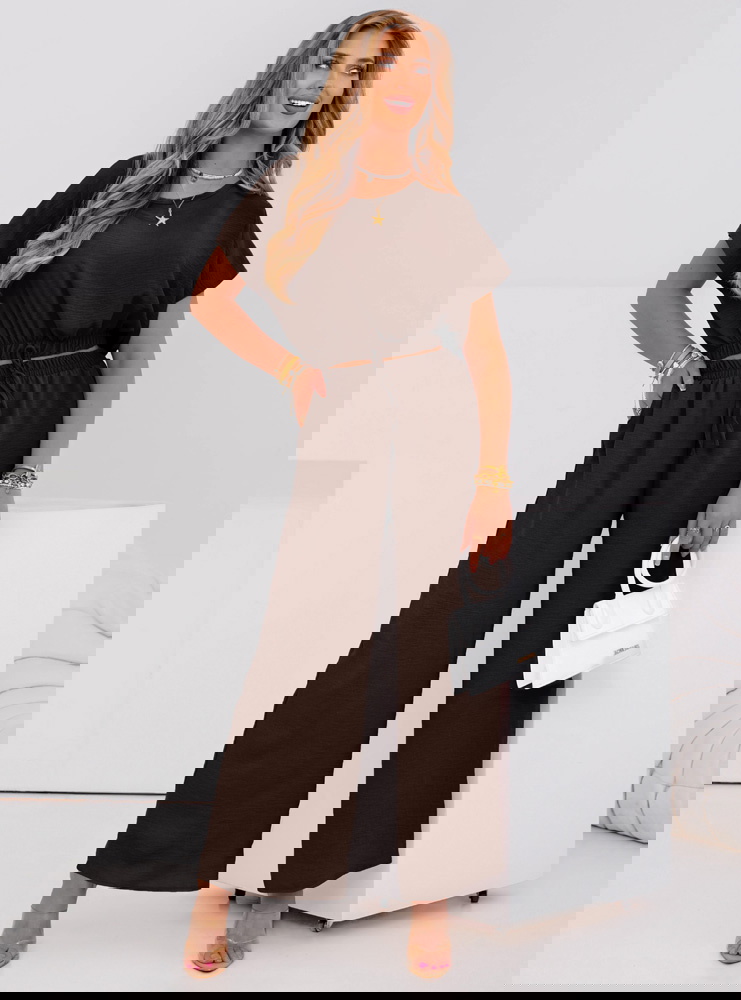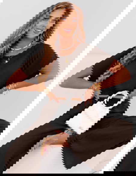 Czekoladowy komplet bluzka i szerokie spodnie Loila to stylowa propozycja dla kobiet, które lubią wygodne, ale efektowne stylizacje. Głęboki czekoladowy kolor nadaje całości eleganckiego charakteru i sprawia, że komplet wygląda bardzo modnie. Bluzka ma luźniejszy krój oraz krótkie rękawy, dzięki czemu świetnie sprawdzi się w cieplejsze dni. W talii znajduje się delikatne wiązanie, które podkreśla sylwetkę i dodaje stylizacji lekkości. Spodnie posiadają szerokie nogawki, które swobodnie opadają i tworzą elegancką linię. Elastyczny pas zapewnia wygodę noszenia oraz dobre dopasowanie w talii. Materiał jest lekki i przyjemny w dotyku, dlatego komplet świetnie sprawdzi się w codziennym użytkowaniu. To gotowy zestaw, który pozwala stworzyć modną stylizację w kilka chwil.