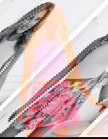 Kwiatowy wzór i rozkloszowany fason tworzą efekt lekkiej spódniczki, która jednocześnie daje wygodę noszenia jak klasyczne spodenki.