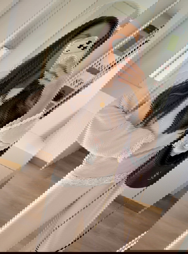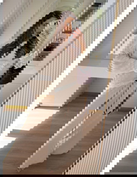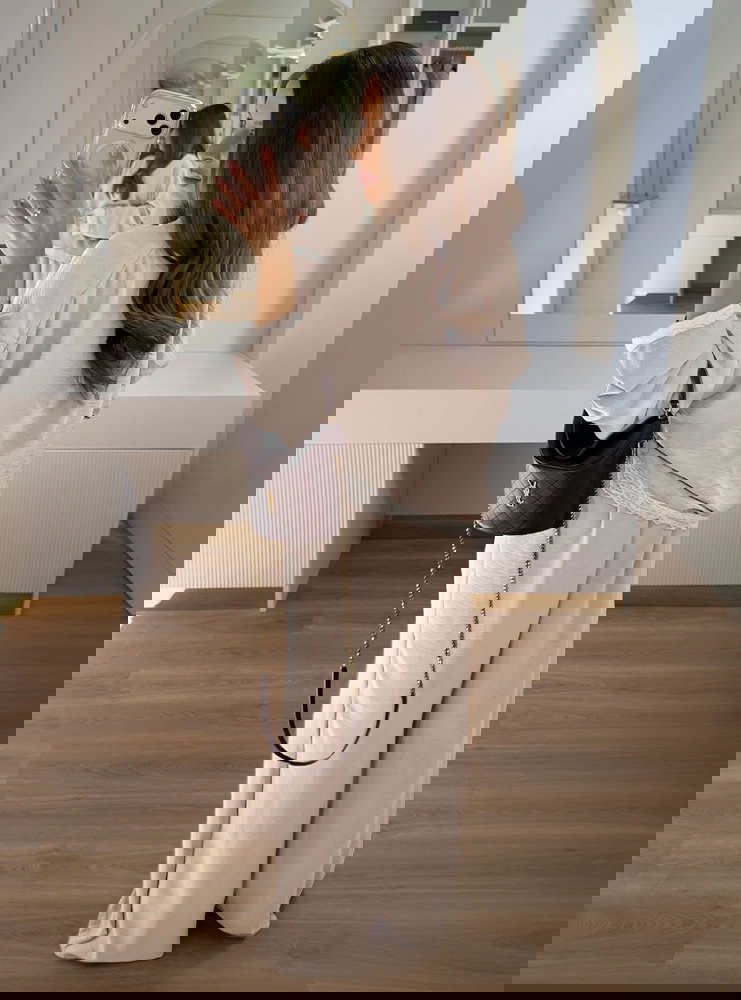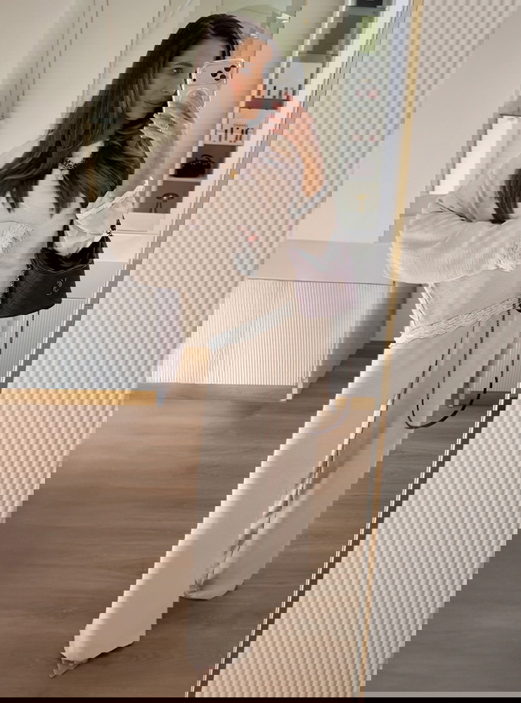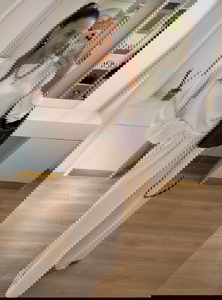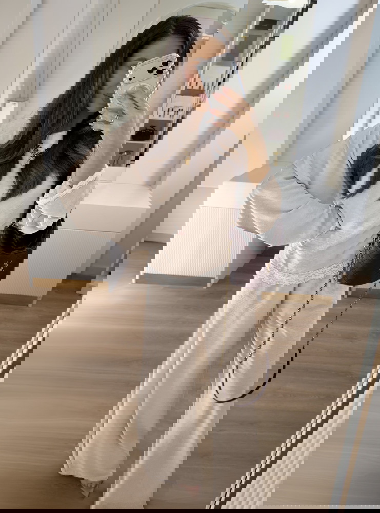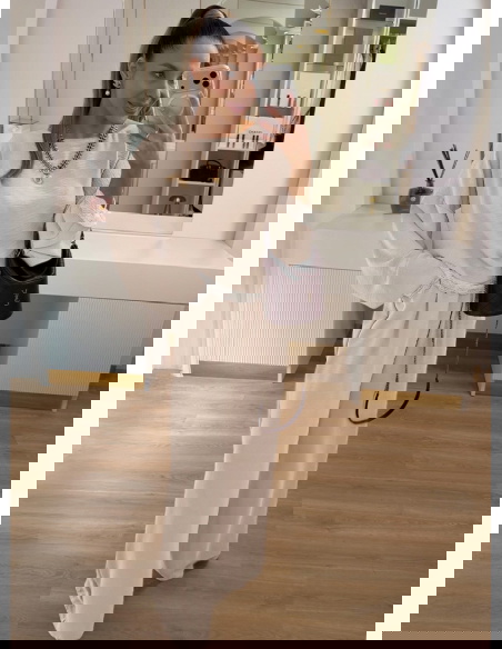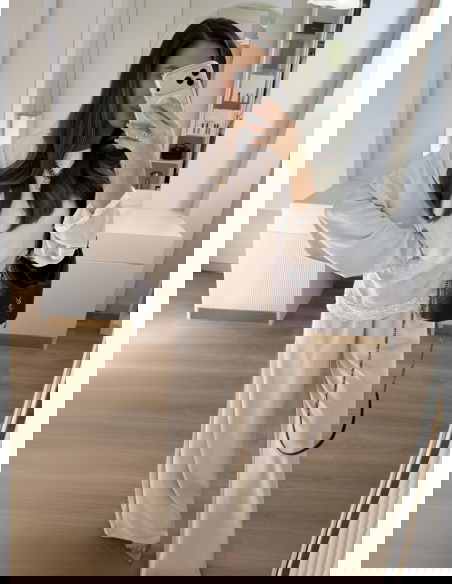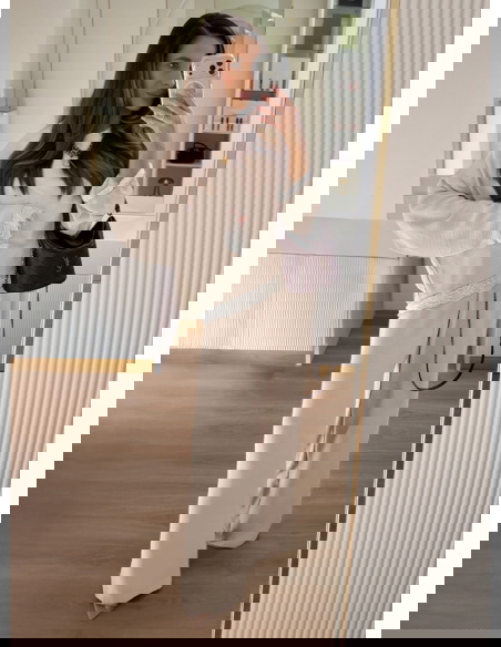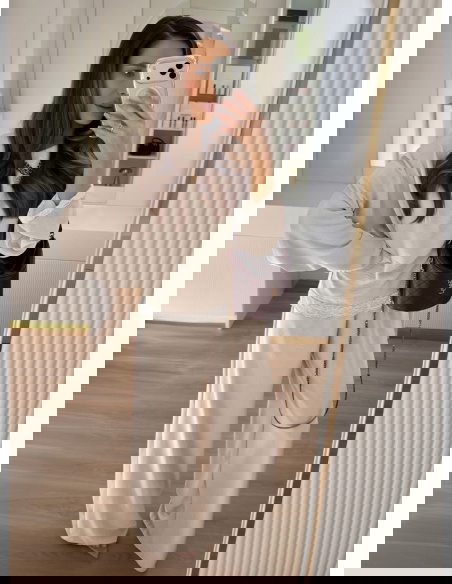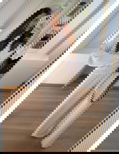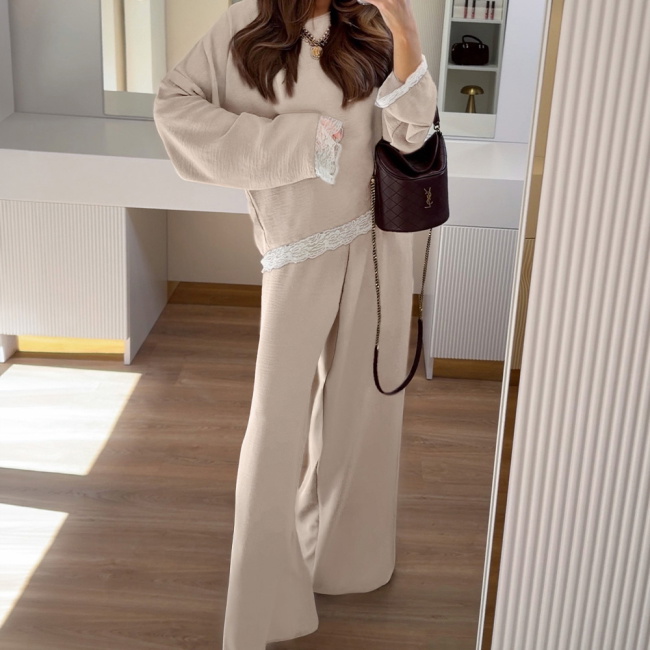 Beżowy komplet z koronkowymi wstawkami bluzka i szerokie spodnie Maevenye