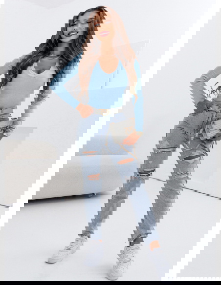 Błękitna prążkowana bluzka z dekoltem...