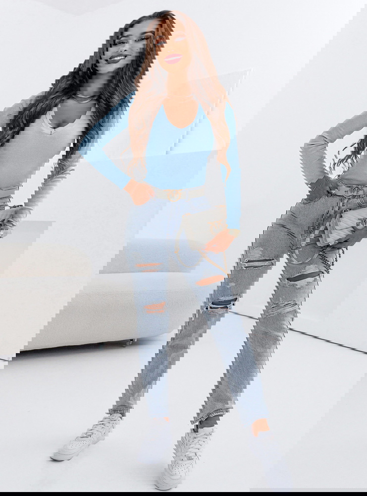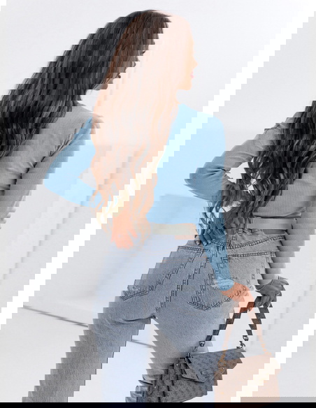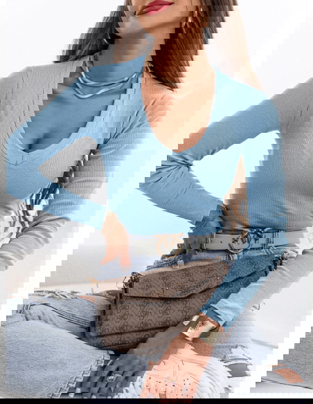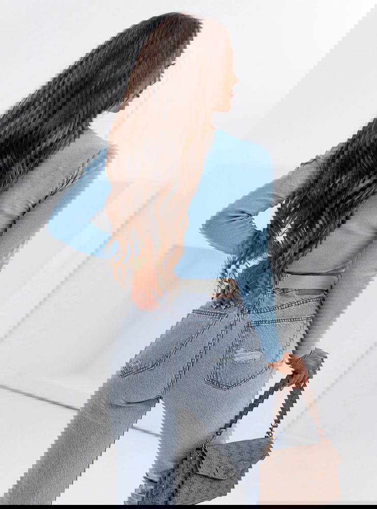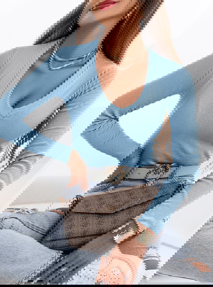 Błękitna prążkowana bluzka z dekoltem w serek Monesa to dopasowany model, który podkreśla sylwetkę i wygląda bardzo kobieco. Prążkowana struktura nadaje jej charakteru i sprawia, że świetnie układa się na ciele. Dekolt w serek subtelnie eksponuje szyję i dekolt, dodając całości lekkości. Długi rękaw sprawia, że bluzka sprawdzi się przez większą część roku i łatwo dopasujesz ją do różnych stylizacji. Fason jest dopasowany, dzięki czemu podkreśla talię i tworzy proporcjonalny look. Błękitny kolor dodaje świeżości i rozjaśnia całą stylizację. To model, który dobrze wygląda zarówno solo, jak i w zestawieniu z marynarką. Idealna baza do codziennych i bardziej dopracowanych outfitów.
