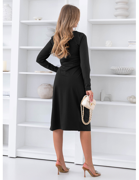 Czarna sukienka midi z rozcięciem Summire to ponadczasowa baza, która zawsze wygląda dobrze i robi efekt. Prosty, zabudowany dekolt równoważy całość i nadaje eleganckiego charakteru. Ozdobne marszczenie w talii podkreśla sylwetkę i optycznie ją modeluje. Delikatne rozcięcie na nodze dodaje lekkości i subtelnej zmysłowości. Długość midi sprawia, że sukienka jest uniwersalna i pasuje na wiele okazji. Długie rękawy dodają klasy i sprawiają, że model sprawdzi się także w chłodniejsze dni. Czarny kolor jest zawsze trafionym wyborem i łatwo zestawić go z dodatkami. To sukienka, którą założysz bez zastanawiania się i zawsze będziesz wyglądać dobrze.