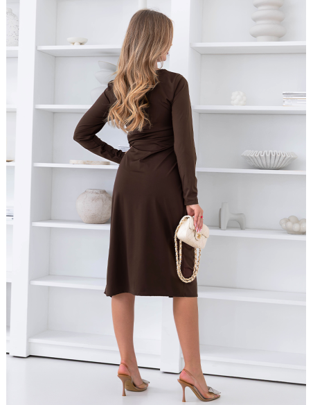 Czekoladowa sukienka midi z rozcięciem Summire to elegancki model, który wyróżnia się kolorem i dopracowanym krojem. Czekoladowy odcień wygląda ciepło i bardzo stylowo, idealnie wpisując się w bardziej stonowane stylizacje. Gładka góra z długim rękawem nadaje całości klasy i sprawia, że sukienka jest uniwersalna. Marszczenie w talii podkreśla sylwetkę i optycznie ją modeluje. Ozdobny detal w pasie przyciąga uwagę i dodaje charakteru. Rozcięcie na nodze wprowadza lekkość i subtelnie odsłania nogę przy ruchu. Długość midi sprawia, że model pasuje zarówno na co dzień, jak i na bardziej eleganckie okazje. Materiał miękko układa się na sylwetce i zapewnia komfort noszenia.