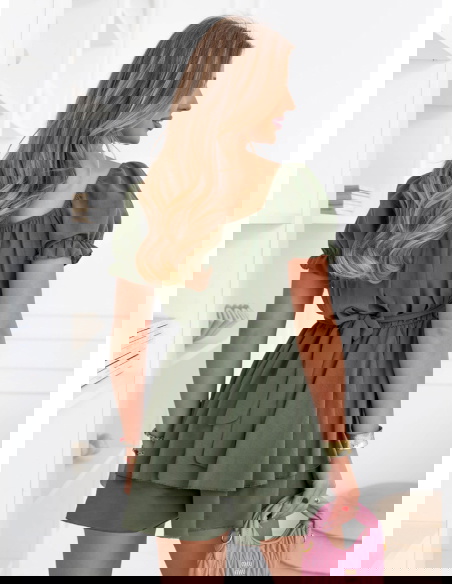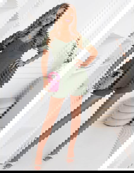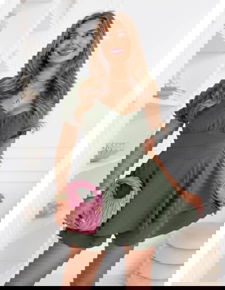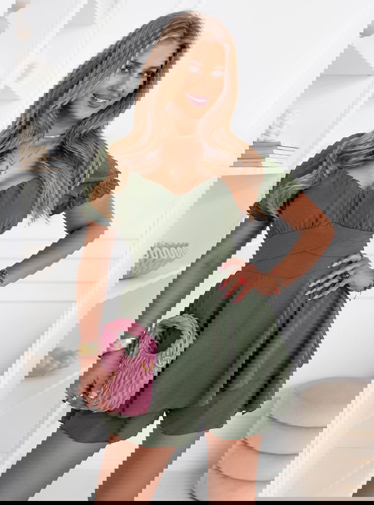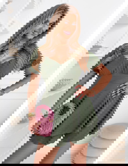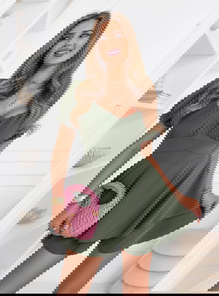 Kombinezon jak sukienka Jubidaa - khaki to model, który daje efekt lekkiej sukienki, ale zapewnia pełną wygodę noszenia. Góra z marszczeniem i dekoltem w kształcie serca podkreśla biust i nadaje całości kobiecego charakteru. Krótkie rękawy z delikatnym wykończeniem dodają lekkości i świetnie sprawdzają się w cieplejsze dni. Talia jest wyraźnie zaznaczona, dzięki czemu sylwetka wygląda proporcjonalnie i bardzo korzystnie. Dół układa się swobodnie i przypomina sukienkę, co daje efekt zwiewności i swobody ruchów. Kolor khaki jest stonowany i stylowy, dzięki czemu łatwo dopasujesz go do różnych dodatków. To model idealny na lato, wyjazdy i codzienne wyjścia. Całość jest lekka, ale robi duże wrażenie.
