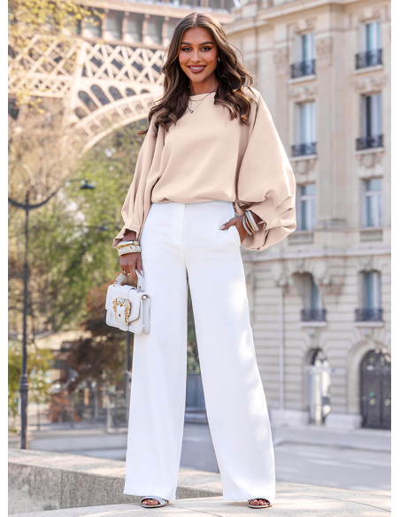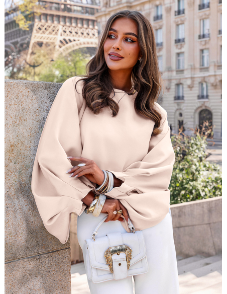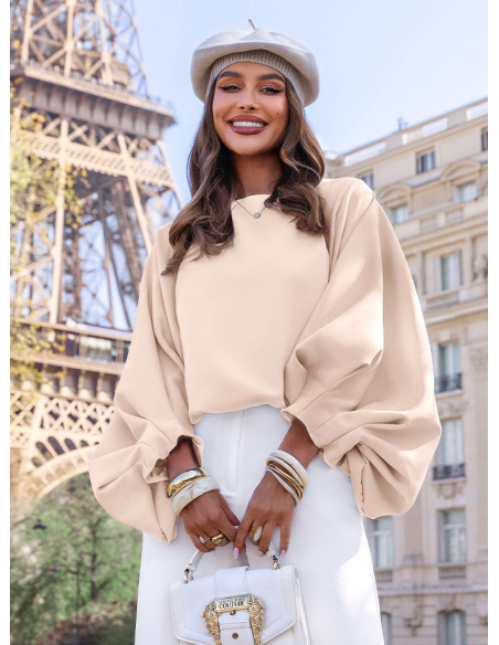 Jasnobeżowa bluzka z bufiastymi rękawami Lisonn wyróżnia się swobodnym krojem i efektownymi rękawami, które nadają jej lekkości i charakteru. Materiał miękko układa się na sylwetce, dzięki czemu całość wygląda naturalnie i bez wysiłku. Szerokie rękawy przyciągają uwagę i dodają stylizacji wyrazistości, jednocześnie zachowując elegancki balans. Prosty dekolt sprawia, że bluzka pozostaje uniwersalna i łatwa do zestawienia. Dobrze komponuje się zarówno z dopasowanymi spodniami, jak i bardziej klasycznymi elementami garderoby. To model, który pozwala szybko stworzyć spójny i dopracowany look. Sprawdzi się w wielu sytuacjach, kiedy chcesz wyglądać stylowo, ale bez przesadnego kombinowania. To subtelna i kobieca propozycja z kolekcji Bonjour Paris, inspirowana lekkością i ponadczasową prostotą.
