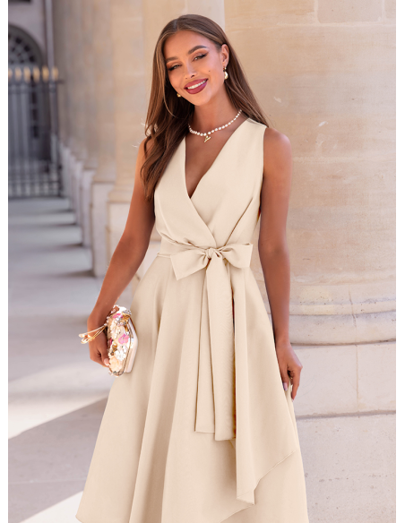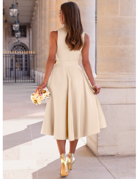 Jasnobeżowa sukienka midi z przekładanym dekoltem Colettie to model, który wyróżnia się subtelną formą i dopracowanymi detalami. Przekładany dekolt nadaje całości eleganckiego charakteru i ładnie eksponuje górę sylwetki. Szerokie wiązanie w talii tworzy efekt kokardy, który przyciąga uwagę i podkreśla proporcje. Warstwowy dół dodaje lekkości i sprawia, że sukienka świetnie układa się w ruchu. Długość midi nadaje całości bardziej klasycznego wyrazu. Jasnobeżowy odcień prezentuje się świeżo i pasuje zarówno do jasnych, jak i kontrastowych dodatków. To propozycja z kolekcji Bonjour Paris, w której liczą się detale i kobiecy efekt.