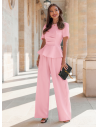 Komplet bluzka i szerokie spodnie Elorette - mocha mousse to elegancka propozycja w głębokim, ciepłym odcieniu. Góra z baskinką podkreśla talię i nadaje sylwetce bardziej kobiecych proporcji. Krótkie rękawy wprowadzają lekkość i sprawiają, że całość wygląda nowocześnie. Szerokie spodnie swobodnie układają się na nogach i optycznie je wydłużają. Odcień mocha mousse dodaje stylizacji klasy i świetnie łączy się z jasnymi oraz złotymi dodatkami. To model z kolekcji Bonjour Paris, w którym minimalizm spotyka się z dopracowanym wykończeniem. Całość tworzy spójny look, który robi efekt bez przesady.
