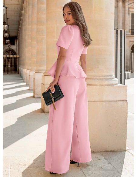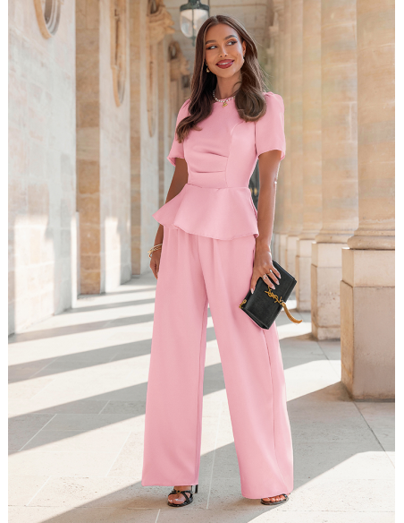 Pudrowy komplet bluzka i szerokie spodnie Elorette przyciąga uwagę delikatnym odcieniem różu i lekką formą. Góra z baskinką subtelnie zaznacza talię i dodaje sylwetce kobiecego charakteru. Krótkie rękawy wprowadzają świeżość i sprawiają, że całość wygląda lekko i nowocześnie. Szerokie spodnie miękko układają się w ruchu, optycznie wydłużając nogi i dodając sylwetce lekkości. Pudrowy kolor nadaje stylizacji romantycznego klimatu i świetnie łączy się z jasnymi dodatkami. To model z kolekcji Bonjour Paris, w którym liczy się prostota połączona z dopracowanymi detalami. Całość tworzy gotowy look, który nie wymaga wielu dodatków.