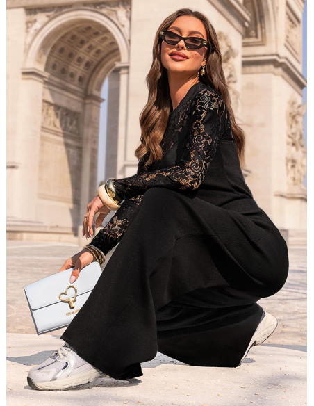 Czarny komplet koronkowa bluzka i szerokie spodnie Eulaliee to połączenie klasycznej czerni z wyrazistymi detalami. Dopasowana góra z koronkowymi rękawami nadaje całości kobiecego charakteru i przyciąga uwagę subtelnym wzorem. Prążkowana struktura materiału podkreśla sylwetkę i dodaje całości nowoczesnego wykończenia. Szerokie spodnie z kieszeniami układają się swobodnie, zapewniając komfort i lekkość w ruchu. Wysoki stan optycznie wydłuża nogi i zaznacza talię. To model z kolekcji Bonjour Paris, w którym klasyka spotyka się z modowym twistem. Całość tworzy spójny look, który wygląda dobrze bez większego wysiłku.